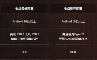 根据开发团队公开的系统适配说明,安卓平台的最低运行门槛相对友好,可覆盖当前主流中端偏下性能机型。具体而言,最低需搭载Android 10或更高版本操作系统;处理器方面须为高通骁龙710、联发科天玑700、华为麒麟970或具备同等级性能的芯片;运行内存不得低于6GB;安装包预占存储空间为15GB。而为获得更稳定帧率与完整画质表现,官方推荐配置为:Android 10及以上系统,处理器至少达到高通骁龙8 Gen 2或联发科天玑9200水平,运行内存8GB,预留存储空间20GB。