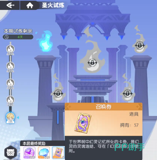 圣火试炼采用绝对公平的竞技环境:所有幻灵统一为固定等级与装备配置;职业命途、图鉴激活、主角品德等养成类加成全部失效;巨龙仅以星级和龙巢作为唯一变量依据。这意味着每位玩家均从完全一致的起跑线出发,胜负关键在于战术理解而非资源投入。整个试炼共设5层结构,每层划分为5个独立进度节点。完成单个进度即可获取钻石奖励;成功通关整层后,除钻石外还将额外获得金币;而第5层最终通关时,必定解锁神话召唤券——该道具为高价值稀缺资源,不可替代。