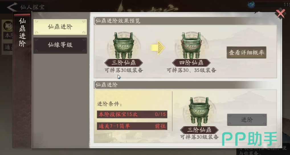 当仙缘积累达到要求后,即可对仙鼎进行升阶操作。升阶条件会在探宝界面明确显示,但需注意该过程存在失败概率。每次尝试前系统都会提示当前的成功几率,建议玩家根据概率判断是否投入材料,合理规划资源使用,避免不必要的损耗。