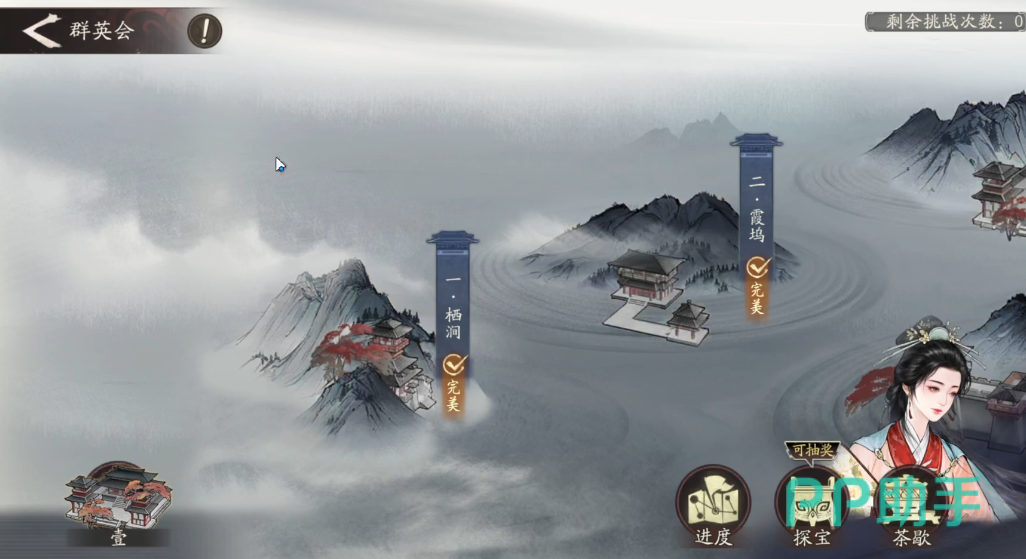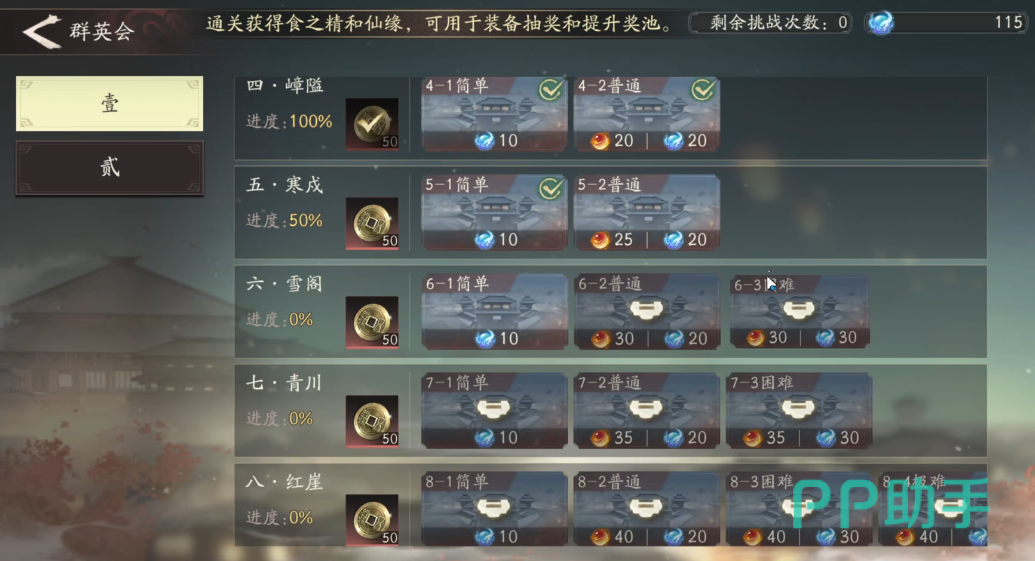 探宝的主要目标是仙鼎,不同等级的仙鼎会对应掉落不同品质的装备。仙鼎的等级上限由玩家当前的仙缘值决定,而仙缘则通过挑战群英会逐步积累。群英会采用类似爬塔的结构,每个主章节下设多个小关卡,每关均提供简单和困难两种难度模式。其中,困难模式所奖励的仙缘更多,因此在队伍实力允许的情况下,推荐优先挑战高难度关卡以加快进度。