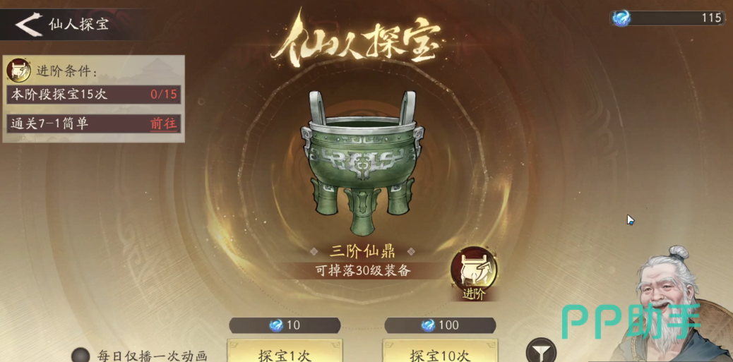 成功完成仙鼎升阶后,装备卡池将随之扩展,可产出更高阶的装备。玩家可根据需求选择单次探宝或直接进行十连探宝。值得注意的是,探宝次数本身也是仙鼎升级的必要条件之一,每次探宝需消耗100单位游戏货币。