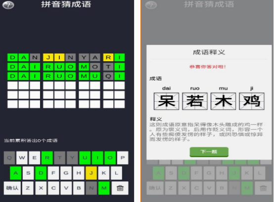 通过此游戏,既能帮助大家,利用拼音的方式来猜出成语,也能考验玩家在拼音,以及识字这方面的水平。在显示出的拼音内容中,你需要正确的完成拼音,如果能组成成语的情况下,就可以帮助玩家顺利的通关。要将字母填在正确的位置上,即使只有一个字母不正确,都会让玩家面临失败的结局,所以一定要在填写的时候认真一些。