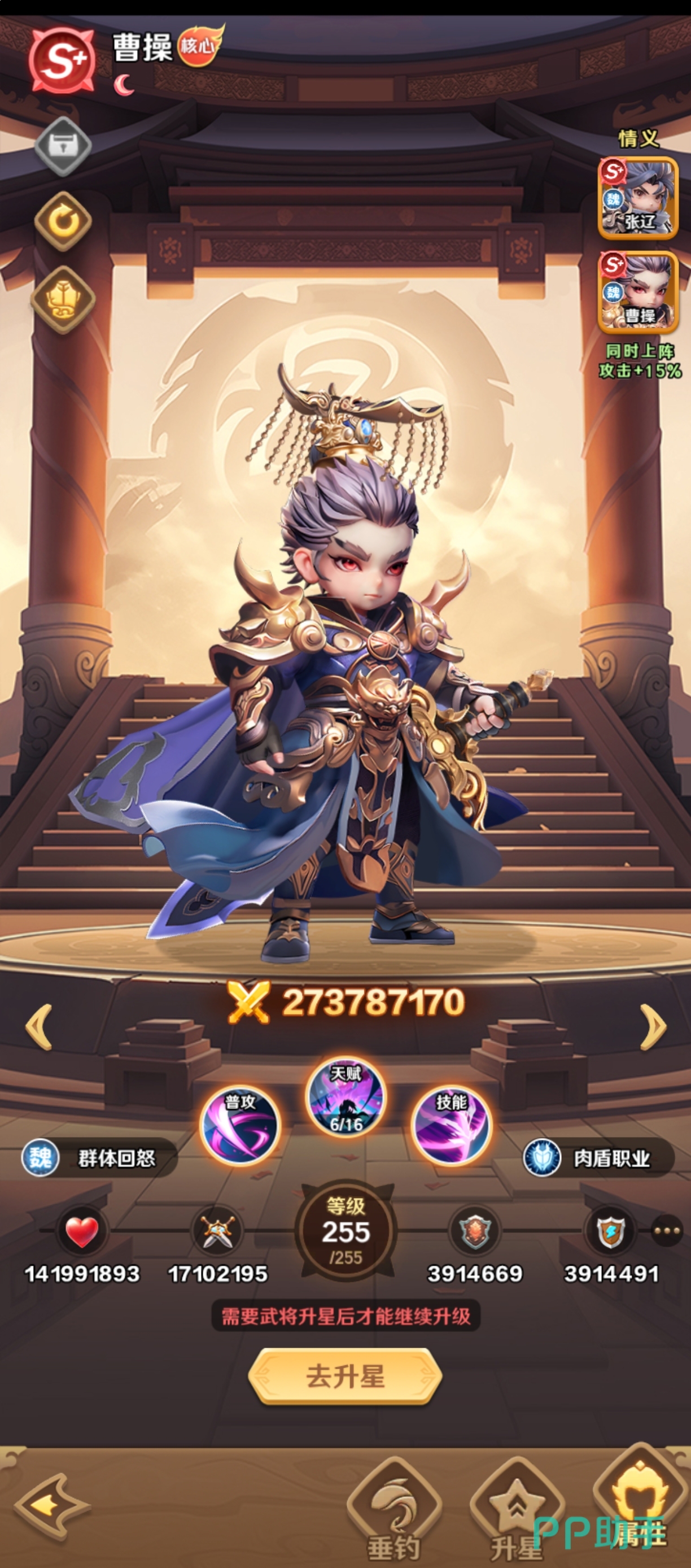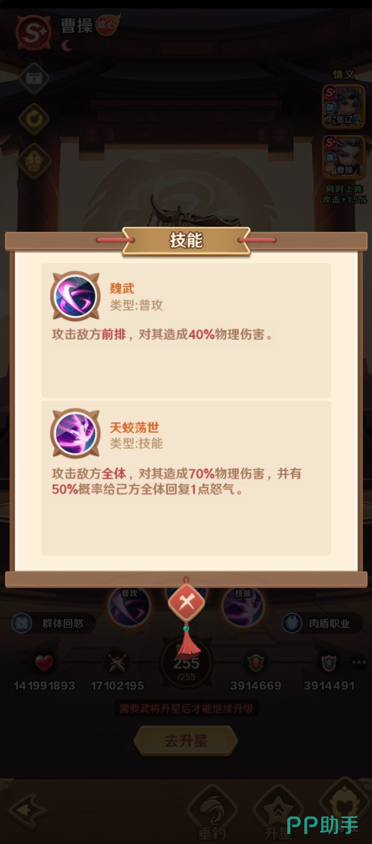 曹操的核心机制围绕“稳定群伤+团队怒气回转”展开。其主动技能可对敌方全体造成70%基础物理伤害,虽单次倍率不及顶尖爆发型武将,但胜在释放频率高、命中稳定。更重要的是,该技能附带概率触发的己方全队怒气恢复效果——这一特性使其成为中后期持久战的关键枢纽。当队伍拥有持续施放大招需求(如依赖多段连招的主C或增益型辅助)时,曹操能显著缩短技能冷却循环,提升整支队伍的节奏掌控力与输出密度。