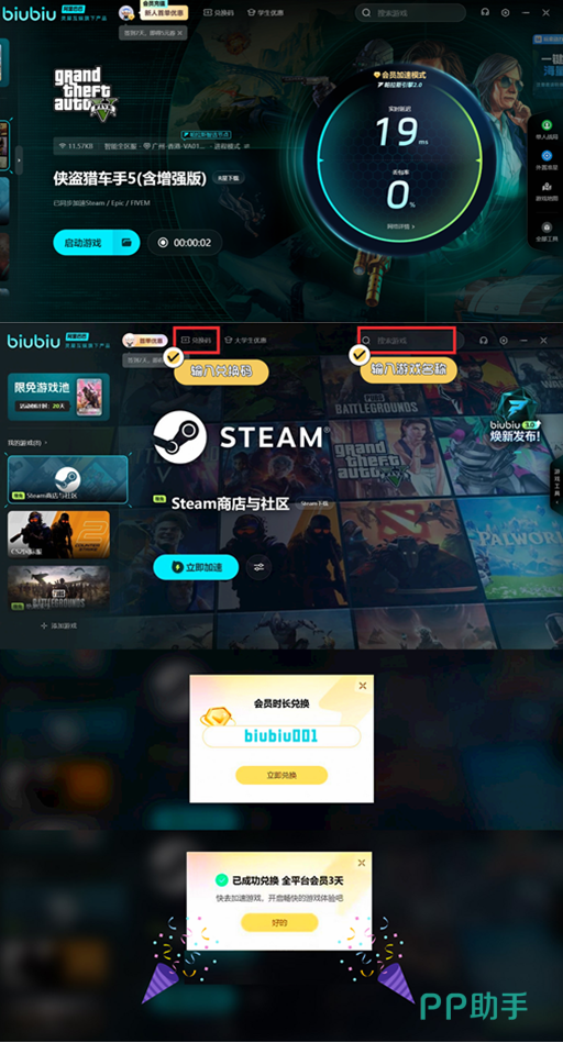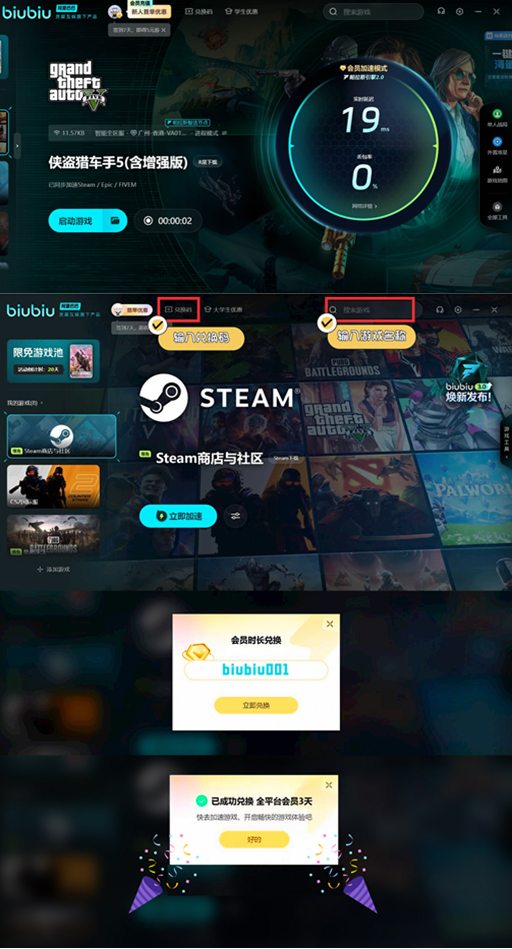 GTA5的在线模式可是需要良好的网络支持,使用biubiu的服务,让你的游戏体验更加稳定,告别卡顿与掉线,畅享每一场竞速与对决。新注册用户一上线就送3小时免费加速时长,轻松升级体验。而且,用兑换码【biubiu001】还能再拿到72小时加速时长,无论是新用户还是老玩家,都能轻松领取,秒到账!新注册和兑换码搭配使用,总共能拿到75小时的加速时长,三天不间断畅玩,网络问题直接拉黑。