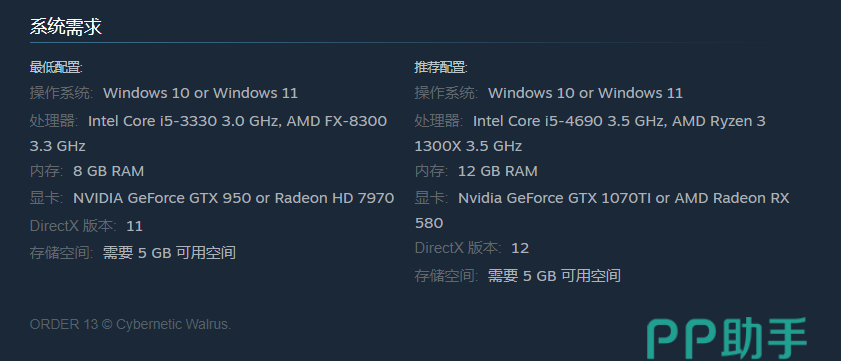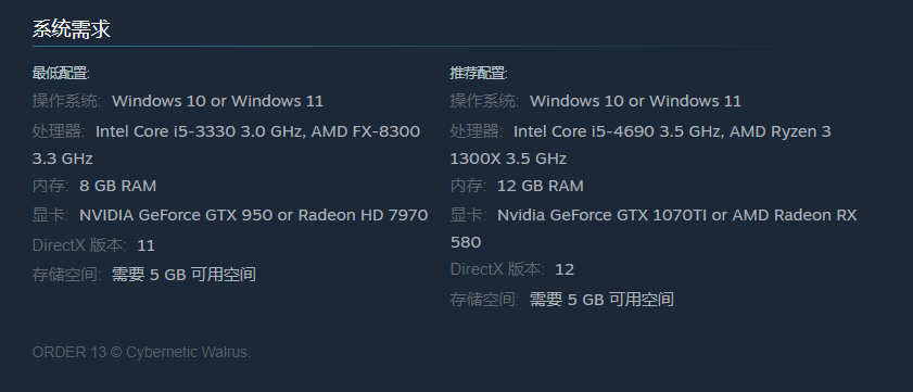 若追求更高画质和更流畅的游戏体验,在配置方面就要有一定提升,推荐处理器不变,内存可达到12GB,显卡为1070TI或Radeon RX 580,并确保有5GB以上的存储空间。