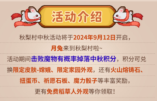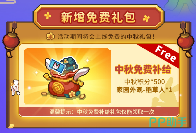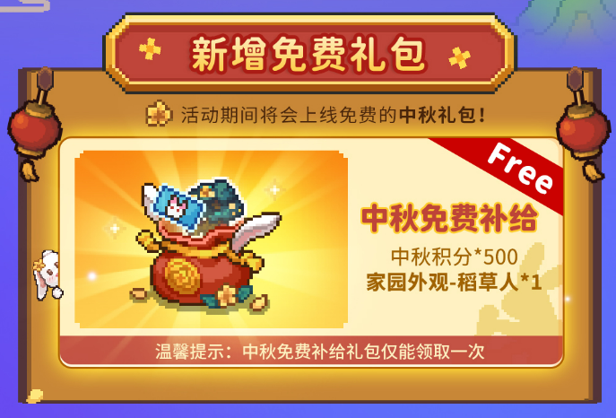 当然,除了击败月兔和积累积分兑换奖励之外,本次中秋活动还为玩家准备了一些免费的福利。活动期间,商城会限时开放免费领取的“稻草人外观”,让你的角色在中秋节期间以全新的形象示人。此外,玩家还可以使用中秋积分在商城内兑换限定的家园外观和人物皮肤,进一步展示自己的个性与游戏成就感。
