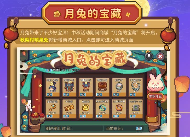 在这次的中秋活动中,最令人期待的就是“寻月宝藏”了。它要求玩家们在节日期间积极挑战魔物,因为在击败它们后,有一定几率可以掉落中秋积分。这些积分并非只是数字,而是你兑换各种限量好物的通行证。通过收集足够的中秋积分,玩家们可以前往商城兑换丰富的奖励,例如独特的限定皮肤、家园的特殊外观设计、扭蛋币甚至是火山熔铸石。