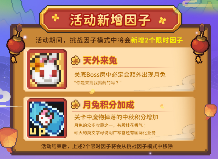为了让中秋活动更加丰富多样,游戏还加入了两个全新的因子,进一步提升了活动的趣味性与奖励力度。第一个因子名为“天外来兔”,它的效果是在每个关卡的BOSS房间内必定会出现额外的月兔。这意味着大家能在普通的关卡中遇到月兔,还可在面对强大的BOSS时,获得更多与月兔交战的机会。额外的月兔就表示着更多的传奇装备掉落,这也给玩家带来了更大的收益。