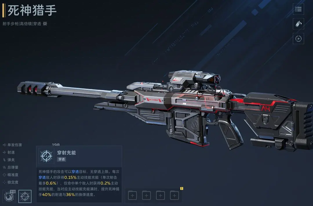 死亡猎手综合性能优异,泛用性强。开启主动技能后,角色进入狂热状态,能量条自动充满,期间射击不消耗弹药且射速提升,持续至能量耗尽。被动技能“强力弹药”支持6层穿透,伤害全程无衰减,每次命中5个目标可恢复10%弹夹容量;若在狂热状态下触发该被动,还将额外获得58%穿透伤害加成,叠加层数越高,总穿透增益越显著,最高可达98%。