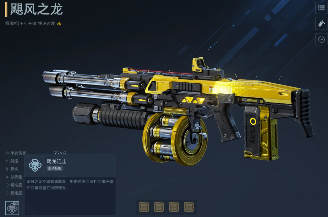首推武器:飓风之龙。该枪在塔防模式中表现突出,尤其适配插件体系完善、金色插件数量充足的玩家。其主动技能可瞬间填满能量条,触发四连发射击,在短时爆发阶段显著增强火力密度;被动技能切换为龙炎弹,命中后产生范围爆炸伤害,具备高效清场能力。