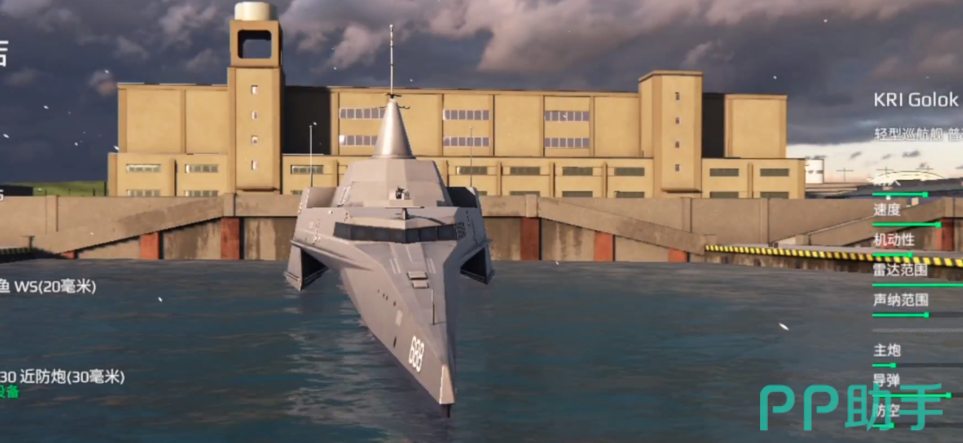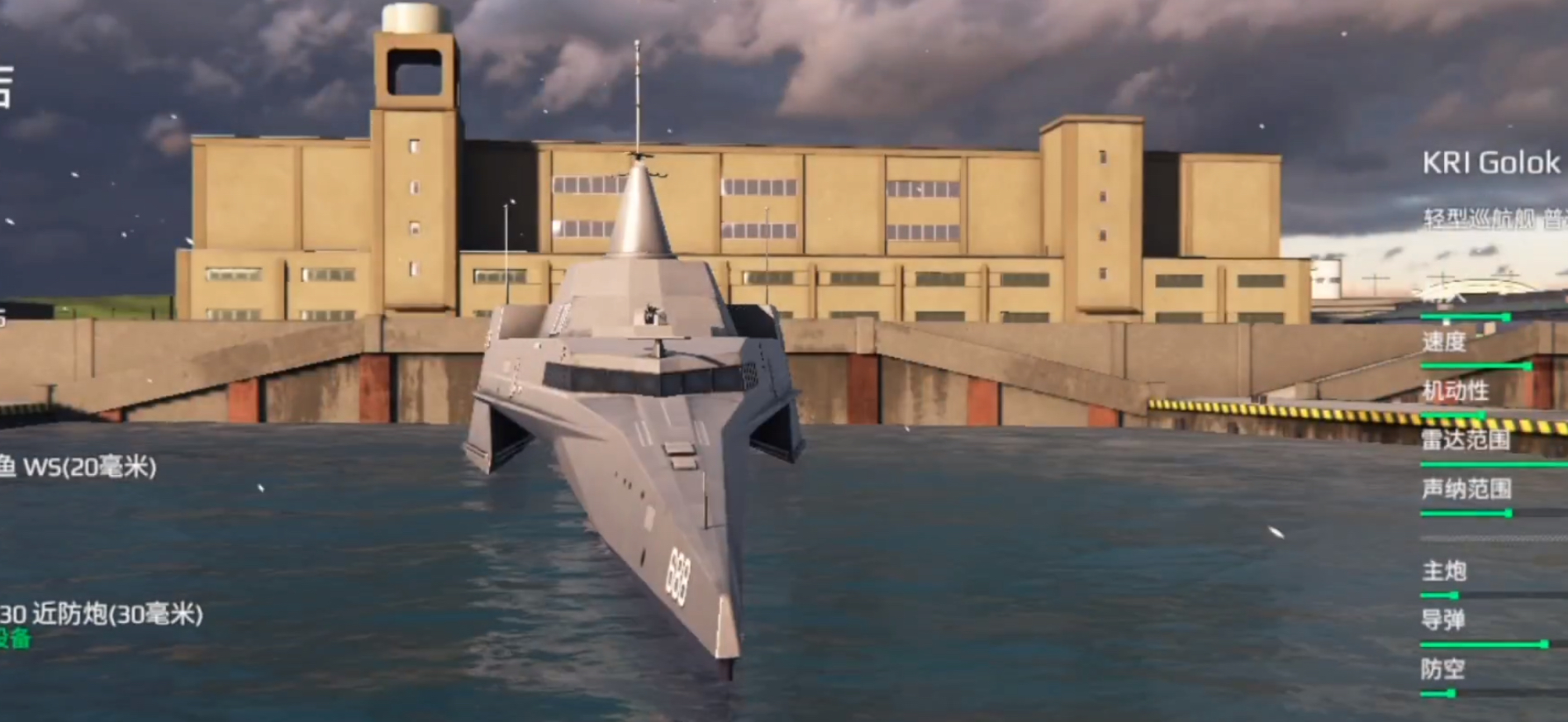 果洛号战舰是属于印尼海军的一艘三体设计战舰,这种设计有助于增加稳定性,减小兴波阻力,为战舰提供更大的甲板面积。果洛号的基础耐力有35960,速度32.1节,机动性3.1,雷达范围16千米,声纳范围1千米,主炮1枚,导弹2枚,防空1枚。从基础属性来看,果洛号的速度,机动性,雷达表现都是不错的,而且防空火力兼备,是比较值得入手的。
