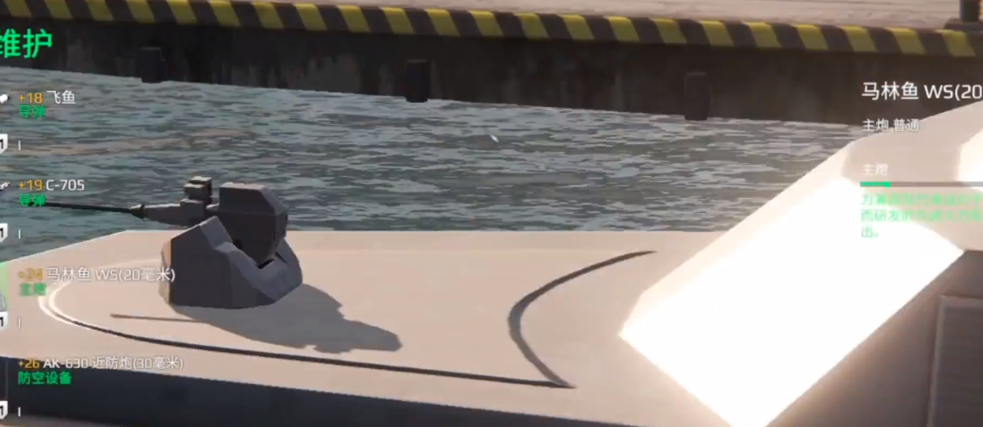 再来说说果洛号的武器,导弹使用的是飞鱼,是法国制造的多功能中层反舰导弹,目前已经在超火25个国家服役。第二个导弹是国产c705导弹,是c704的升级版。再就是主炮,装备的是马林鱼,可以达到9000多的伤害值,虽然这个伤害对于二级三级的玩家来说是低了点,但是对于一级玩家来说是非常够用的。防空装备的是俄罗斯的AK,属于近防炮,对于导弹,直升机和战机的打击能力还是比较强的。