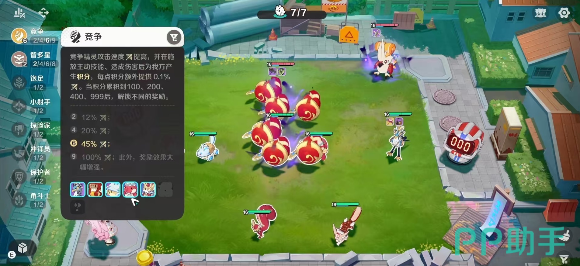 “竞争”这一元理在游戏中具有特殊意义。拥有该特性的精灵不仅基础攻速更高,在释放技能并造成伤害后还能为队伍累积积分。每1点积分可提供0.1%的额外攻速加成。当积分达到100、200、400和999时,将激活阶段性奖励。例如:积分满100时,所有竞争系精灵获得35%的攻击力与法术强度提升;200分时可发射6次迅捷刺拳,随机打击敌方单位并造成魔法伤害;400分时则触发左勾拳与右勾拳组合技,对随机目标施加伤害。此外,场上每多一名同属竞争元理的精灵,即可增强整体羁绊效果。当凑齐9个竞争精灵时,全队攻速额外提升100%,大幅强化输出节奏。