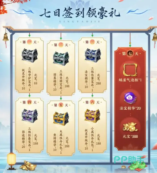 七日连续签到计划同步启动。每日登录即可领取对应资源:第1至6日依次发放灵石、灵魄结晶、炼器精粹、灵契卷轴、灵根培元液及星轨引灵符;第7日额外解锁限定气泡框【螭雀】,具备唯一编号与收藏属性,不可交易、不可重复获取。该活动无等级或任务限制,仅需每日进入游戏点击签到界面即可完成。