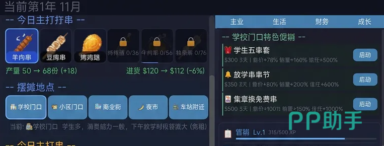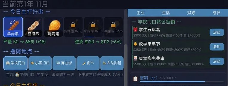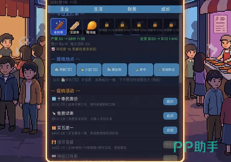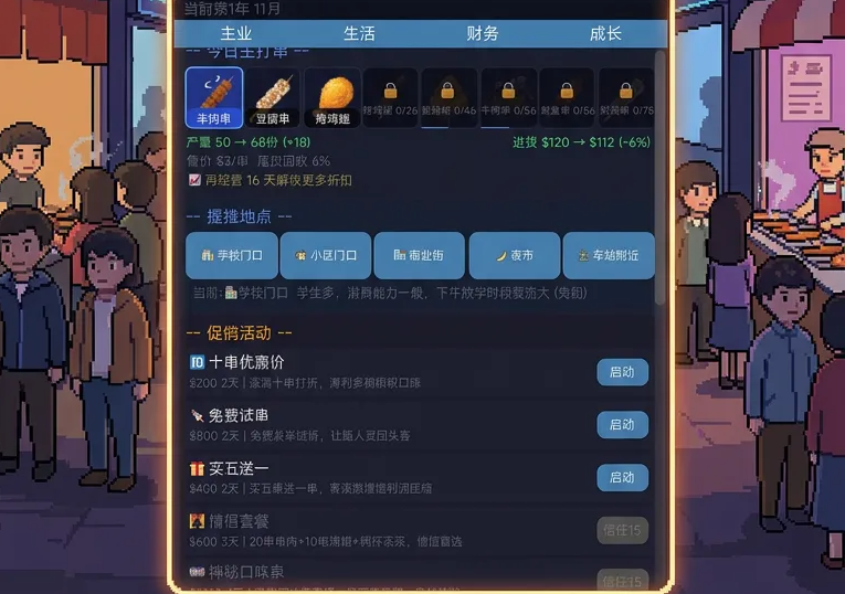 玩家可自由规划每日营业地点——地铁口、大学城周边、老城区夜市、工业园区门口等真实高频消费场景均被还原。同时支持自定义促销策略,如限时折扣、满赠活动、会员积分体系等,有效提升翻台率与复购率,加速资金回笼节奏。