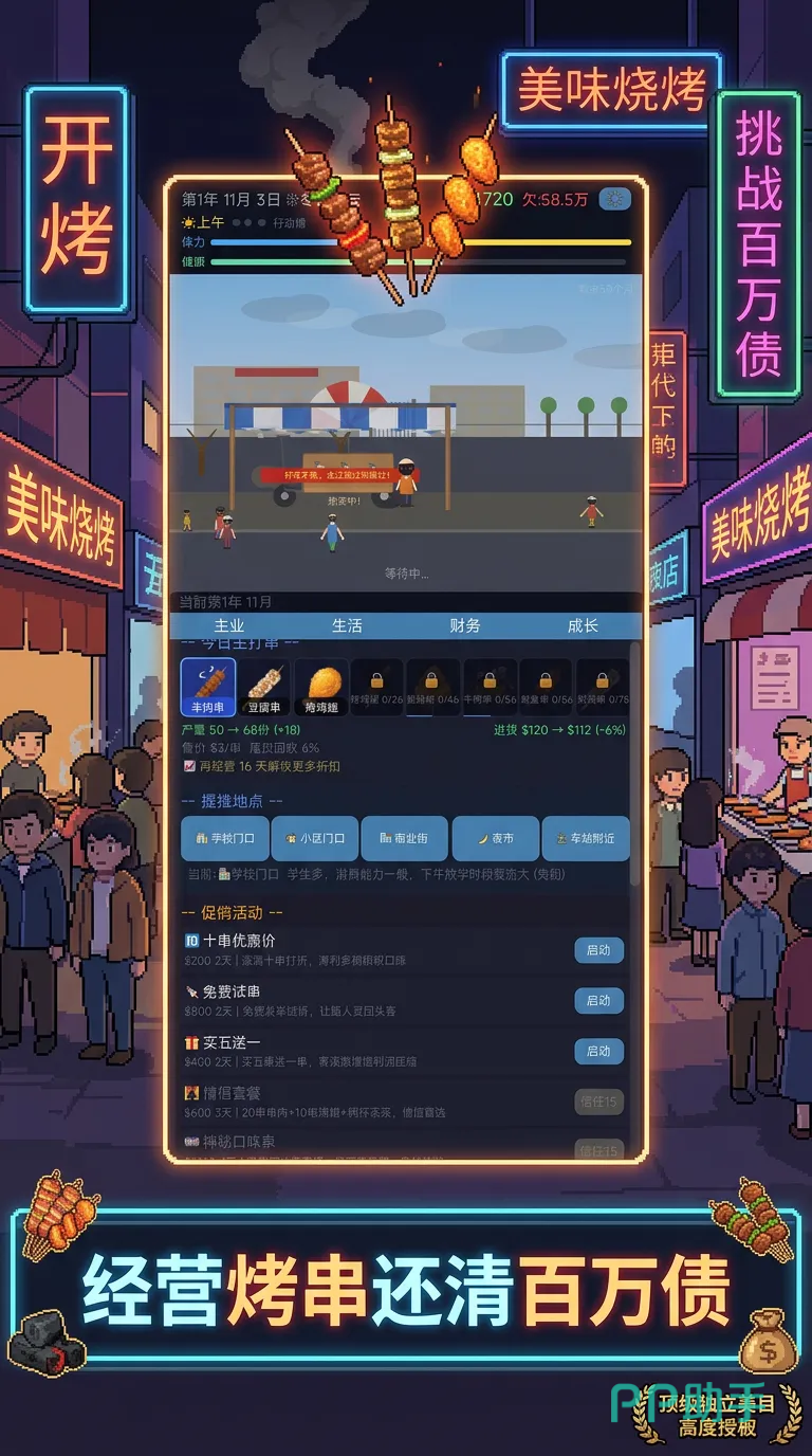 随着经营规模扩大与利润稳定增长,玩家将逐步偿还初始设定的百万级债务。当资产净值突破临界点后,即可解锁连锁加盟、品牌授权、中央厨房建设等进阶玩法,真正实现从小摊贩到烧烤大亨的身份跃迁。