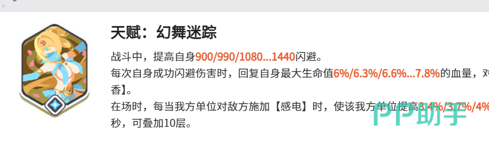 天赋【幻舞迷踪】构成其战斗底层逻辑:持续作战中最高可叠加至1440点闪避值,显著降低受击概率;每次成功闪避后,恢复自身7.8%最大生命值,并对目标施加“醉步迷香”状态(持续期间影响后续技能增益)。当友方单位触发感电效果时,莎乐美获得5.2%伤害提升与减伤效果,该增益可叠加至10层。升至7级后,全图范围触发“满城醉步迷香”,生成持续5秒的中等范围魅惑效果,并同步恢复30%最大生命值——该效果每目标15秒内仅生效一次,是扭转团战局势的关键保底手段。