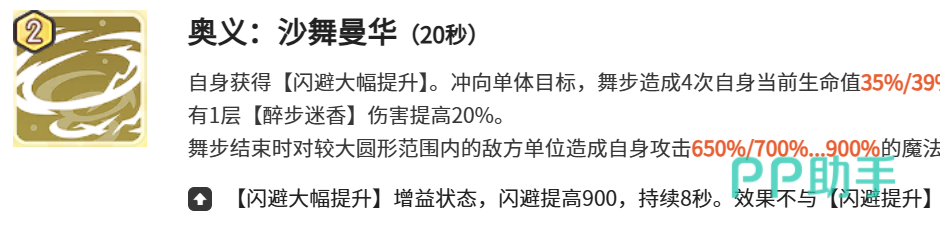 奥义技能【沙舞曼华】冷却时间为20秒,开启后提供8秒90点基础闪避加成;随后向目标方向连续踏出四步,每步造成相当于自身当前生命值55%的魔法伤害;若目标已存在“醉步迷香”状态,则每次伤害额外提升20%;终章阶段释放大范围AOE,造成900%基础魔法伤害,并为自身叠加2层“遗言”效果。配套绝技【雷舞流沙】冷却16秒,激活后立即获得相当于最大生命值43%的护盾,持续12秒,实现攻防节奏无缝衔接。