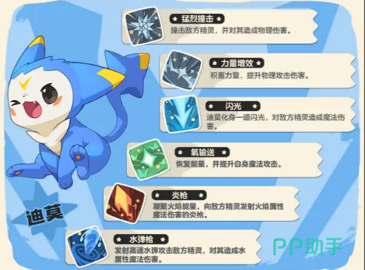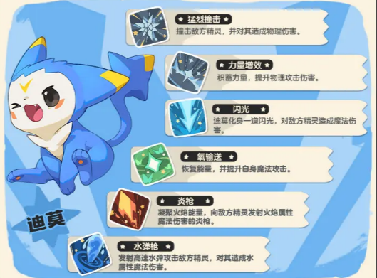 迪莫是光系的精灵,拥有独特的“闪光”技能,它能让迪莫在瞬间变成一道耀眼的闪光,对敌人造成魔法伤害。每学习一个新的技能,迪莫的攻防都能得到提升,非常适合那些喜欢不断提升自身实力的玩家。它的“氧输送”技能不仅可以恢复能量,还能增强魔法攻击,而“炎枪”则能将火焰的力量集中并射向敌人,造成强力的火属性伤害。