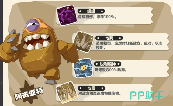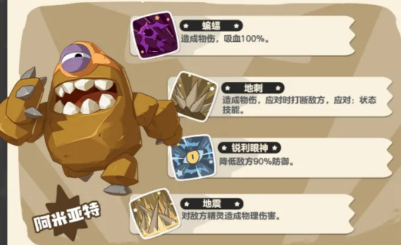 阿米亚特是地系精灵的代表之一,它的特性让它在能量不足时,能自动消耗少量生命值来代替能量。这种特性意味着,在你战斗时,阿米亚特能确保自己在关键时刻不会缺少能量。它的技能“蝙蝠”能造成物理伤害并吸血,让阿米亚特在输出的同时保持自己的生命值。再加上“地刺”能对敌人造成伤害并增加防御,阿米亚特不仅能打击敌人,还能有效增强自己的防守能力,是个十分稳重的精灵。