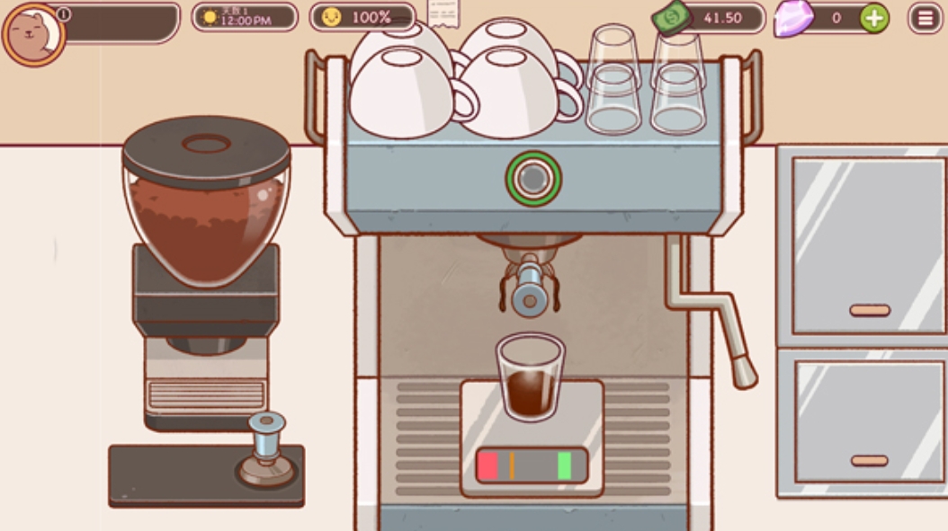 接取咖啡粉后,玩家需均匀的将咖啡粉撒在滤网中,在布粉完成后,玩家需要开启咖啡机进行萃取。在萃取的过程中,玩家需要仔细关注咖啡液的颜色和流量,当咖啡液达到绿色标记时,应立即停止萃取。
