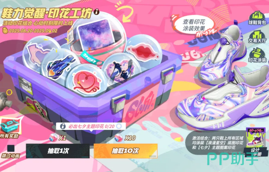 不过,最值得一提的,还是当你把“浪漫星空”底图和七夕主题印花涂装在同一双球鞋上时,所解锁的“心动时刻”特殊组合。想象一下,穿上这双星河般的球鞋,脚下的粉紫渐变与爱心特效交织在一起,每一步奔跑,仿佛都带着爱情的光辉在闪耀。
