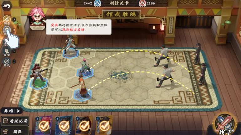 阵法系统支持5人同台作战,角色间羁绊效果按激活等级分为三级:基础级(3角色同羁绊)、进阶级(4角色同羁绊)、满级(5角色同羁绊)。羁绊等级越高,属性加成与特效联动越显著。部分英雄具备多重羁绊兼容性,如程应华可同时激活“迅捷”与“破竹”两类独立羁绊,使阵容构建更具弹性。主流搭配方案包括纯五人同羁绊阵容,或采用3+2双羁绊组合——前者追求极致共鸣增幅,后者侧重功能互补与战术容错。