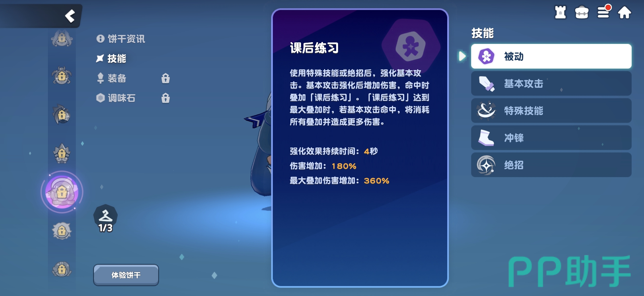 奶油苏打饼干为近战砍击型输出单位,核心机制围绕“强化普攻”展开:每次释放特殊技能或绝招后,可激活持续4秒的【强化状态】,期间基础攻击伤害提升,并命中时叠加层数;叠满后,下一次普攻将消耗全部层数,触发额外高额伤害。该循环明确——“技能→强化普攻→技能→强化普攻”,强调节奏把控与输出窗口管理。其特殊技能具备三段连续挥砍,绝招则为单体前方高伤斩击,整体设计简洁高效,适配快节奏近战压制场景。