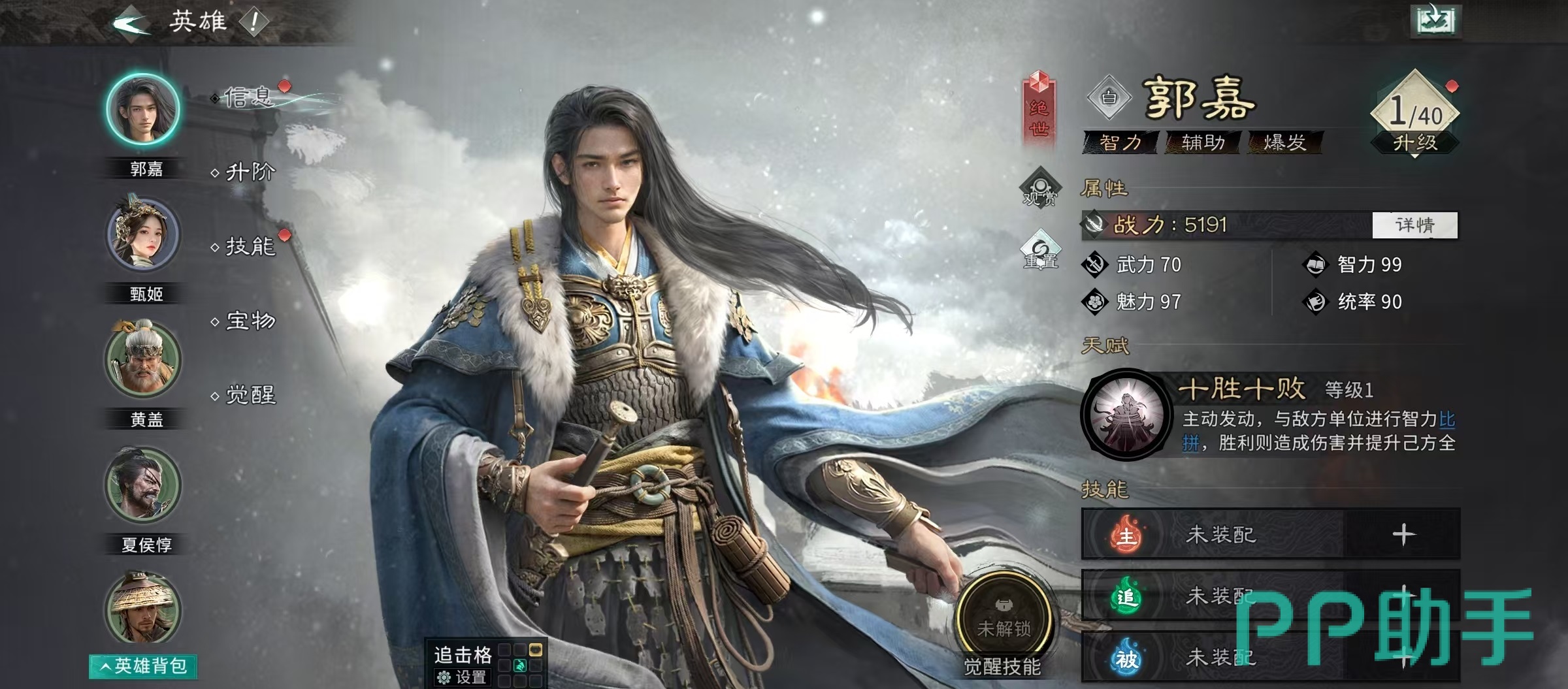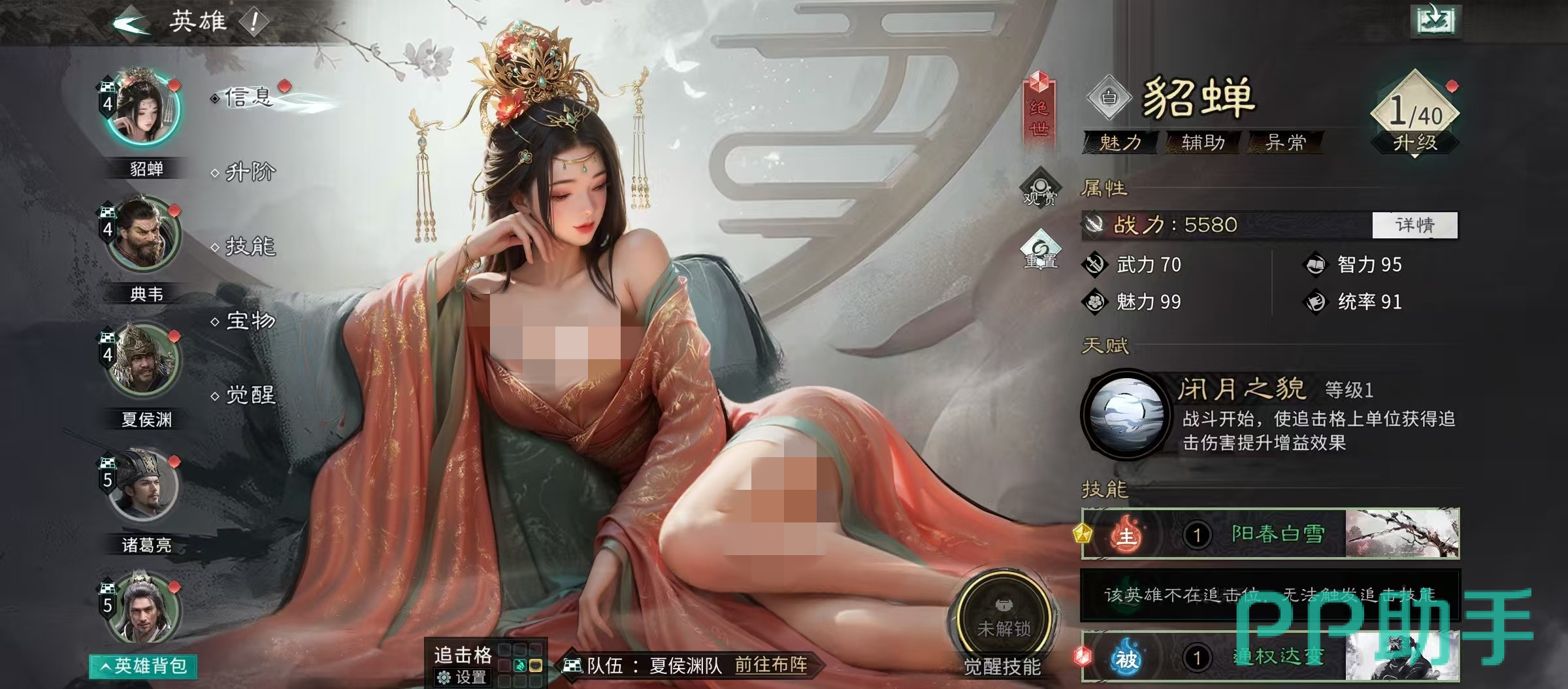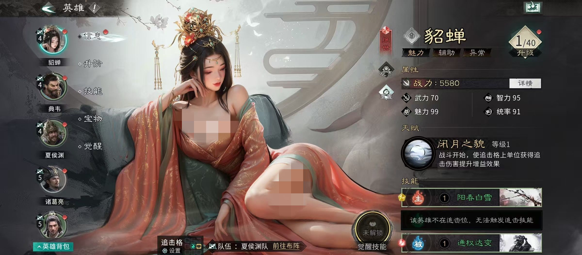 技能搭配方面,许褚主选追击技【万军取首】,该技能不仅基础单体伤害突出,更在自身兵力低于一定阈值时触发额外伤害加成;而许褚在实战中极易进入低兵力状态,因而该加成可高频生效。被动技推荐【白虹贯日】,显著提升暴击率,配合暴击类宝物,使暴击输出趋于稳定可控。郭嘉主动技选用【兵无常势】,追击技配置【临危不乱】,被动技携带【运筹决胜】;貂蝉主动技使用【通权达变】,被动技选择【兵无常势】,形成技能释放效率与追击频次的双重保障。