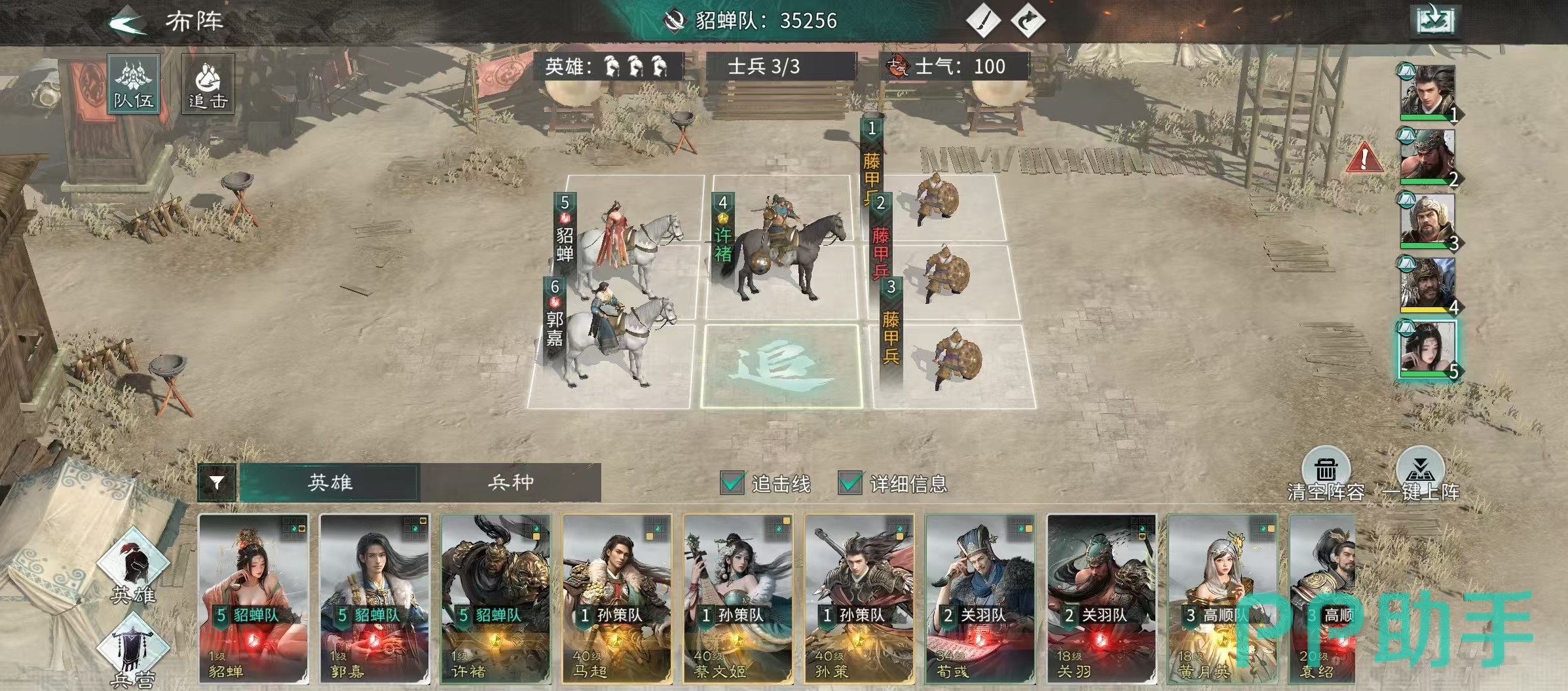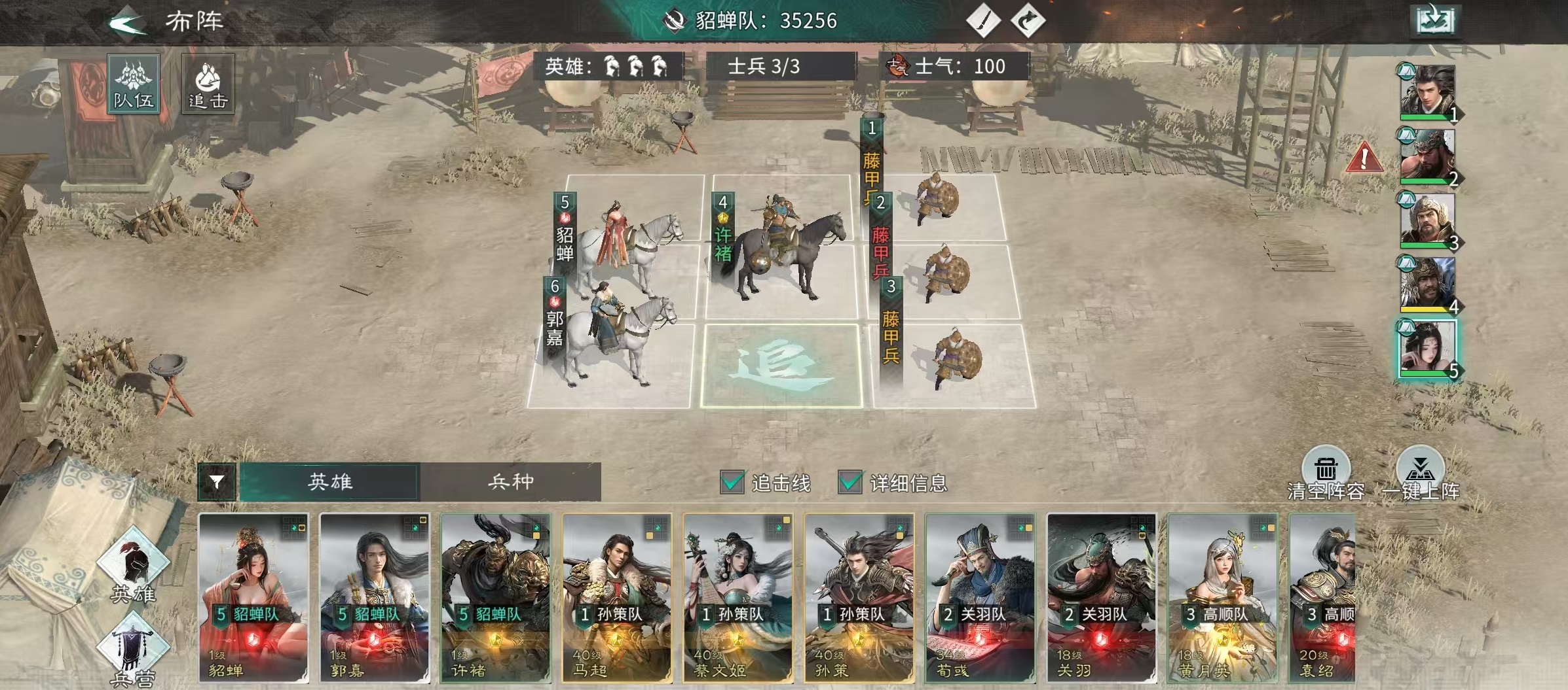 选择许褚作为主C,源于其独特的机制设计——可将防御属性按比例转化为攻击力,并具备锁定“血战目标”的主动技能,确保伤害集中于敌方战力最高单位。其觉醒技虽附带易伤效果,但同步提供更高额的伤害加成,进一步放大对锁定目标的压制力。兵种配置上,除许褚、郭嘉、貂蝉外,其余三格均部署藤甲兵,并统一前置至第一列承担承伤任务。具体站位布局已在配图中清晰标注,可直接参考部署。需注意:所有英雄需完成对应养成阶段,方可激活全部技能与属性加成效果。