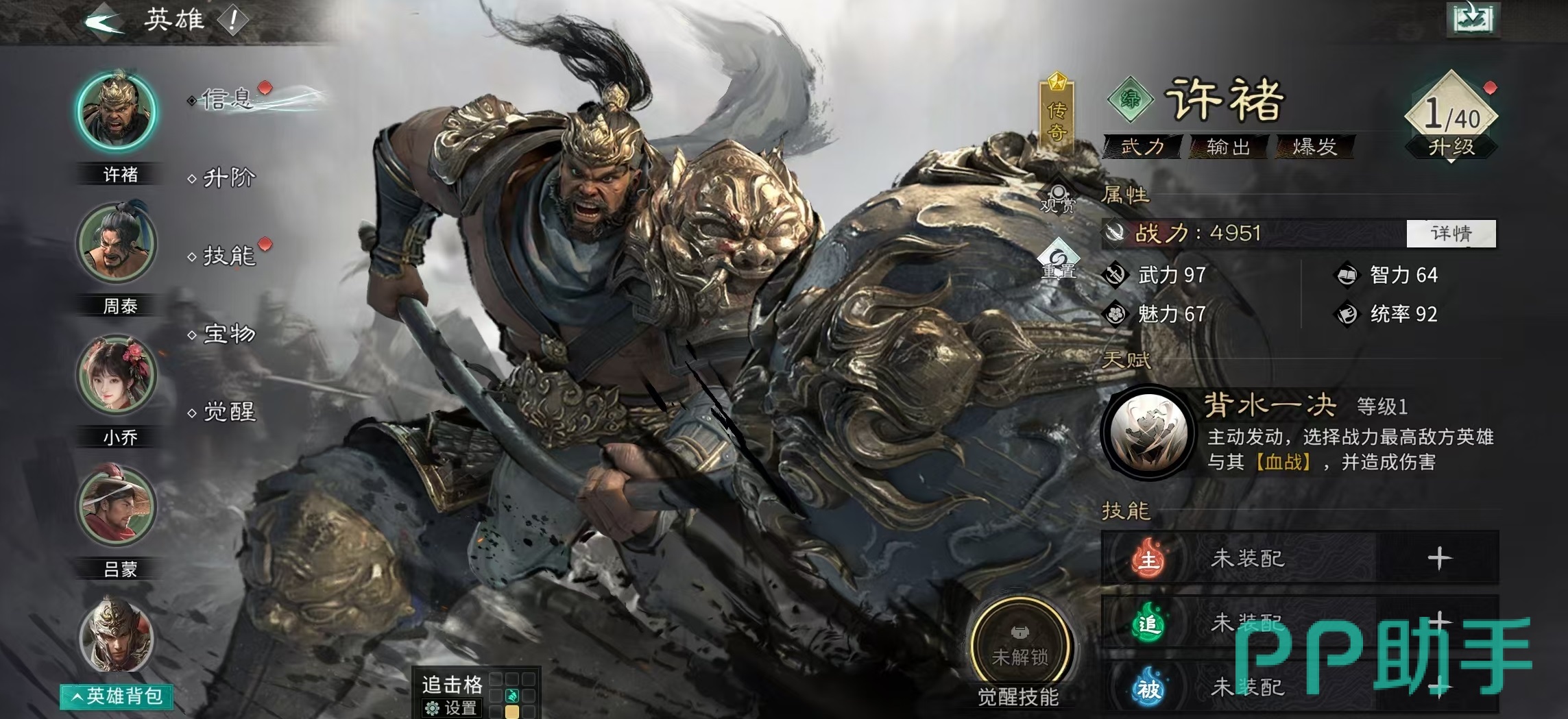 《三国天下归心》以差异化武将机制著称,每位角色拥有专属天赋与觉醒技,其余技能需玩家自主组合,显著提升策略深度与战斗变数。本期聚焦高爆发单点突破体系——许褚点杀流阵容,核心思路是以许褚为绝对输出核心,辅以郭嘉、貂蝉构建协同增益闭环,实现对敌方关键单位的高效斩杀。