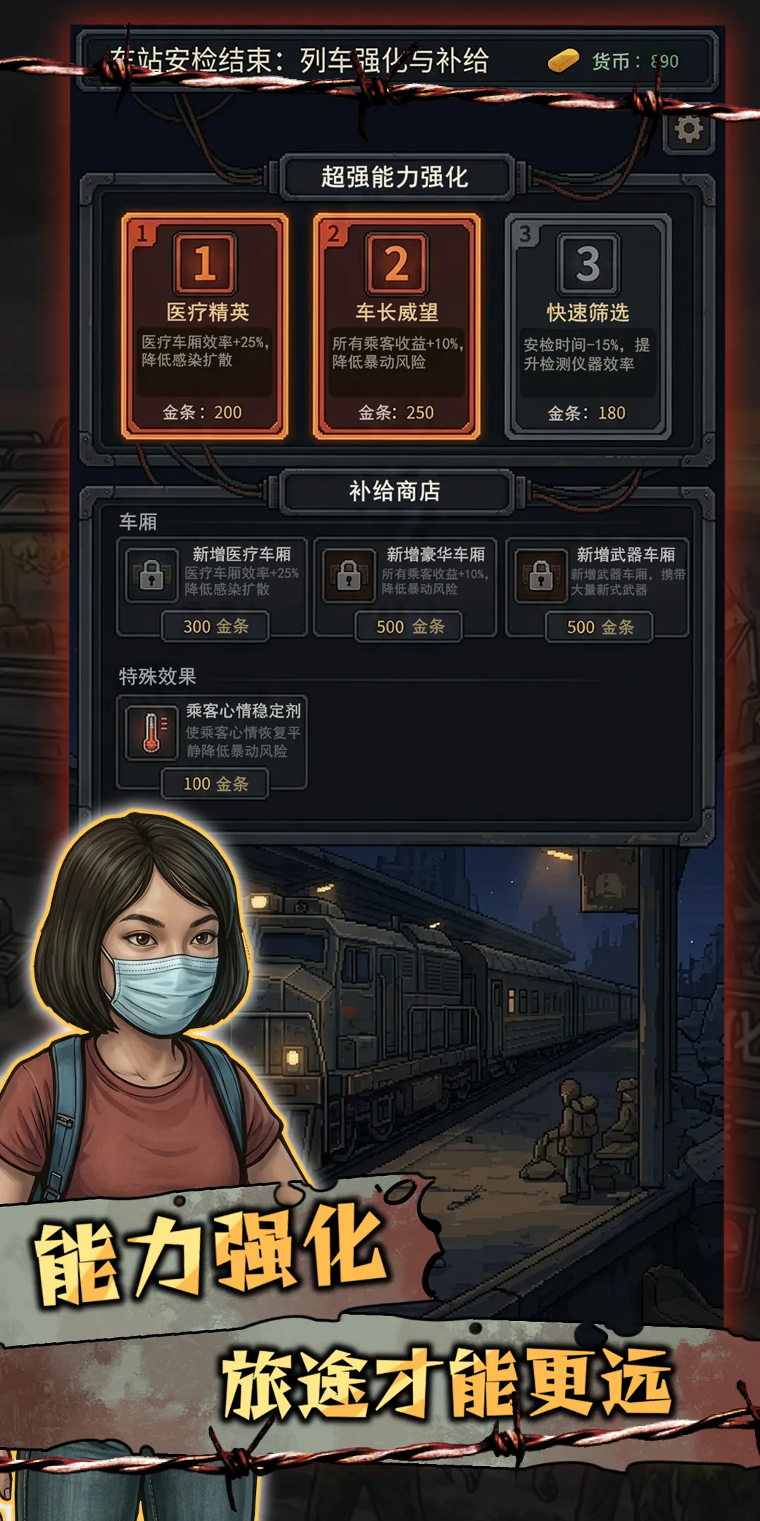车厢空间有限,食物、净水剂、医疗包、燃料等物资持续紧缺。玩家需在救治重伤员、婉拒无害但非必要人员、清除高风险个体之间反复权衡;同时招募具备工程、医疗、战斗或后勤专长的幸存者,并为其匹配对应岗位,推动列车系统逐步升级与功能拓展。