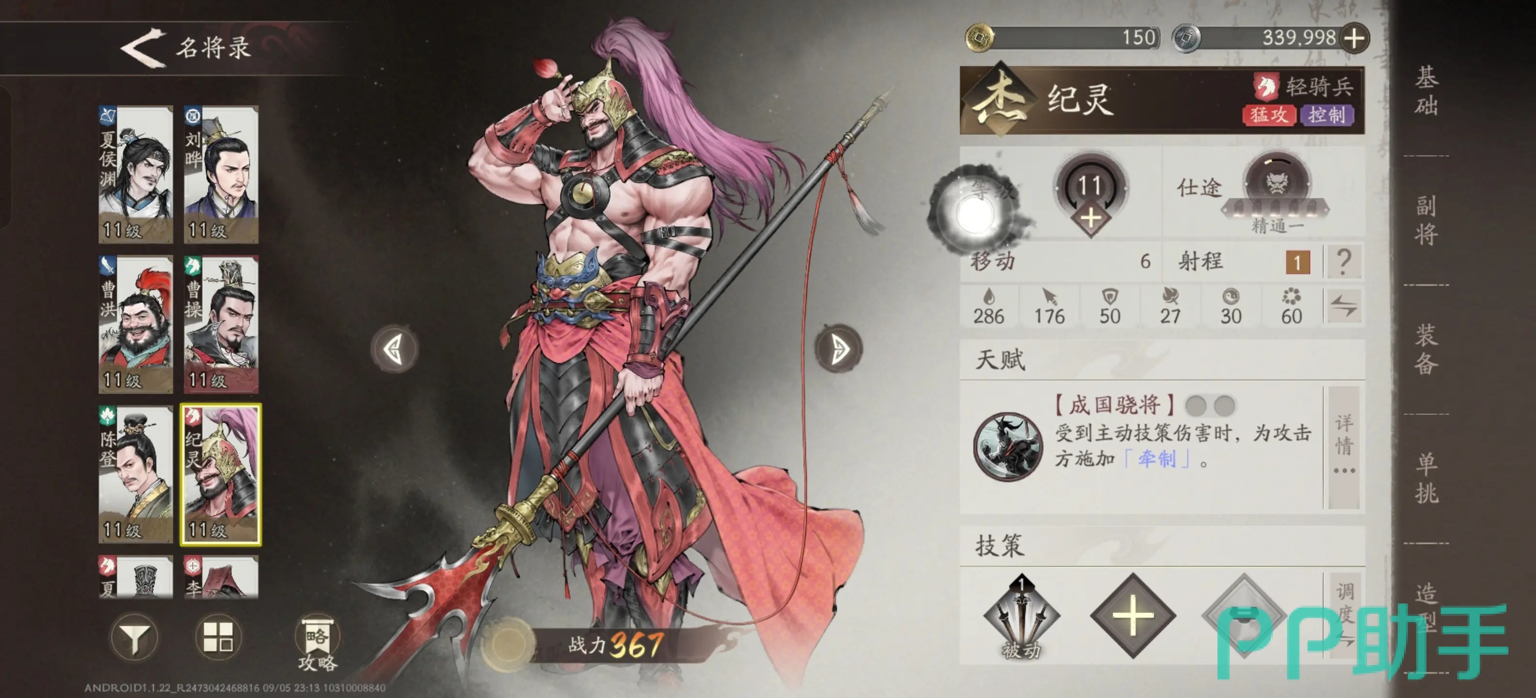 尽管纪灵可作为可培养角色加入队伍,但并不推荐将其设置为主帅核心进行资源倾斜。他的真正优势体现在副将位置上的战术协同能力。当纪灵升至二阶和三阶时,技能将解锁定身效果,不仅能有效打断敌方进攻节奏,还能增强己方骑兵单位的缴械控制能力,显著提升整体输出效率。