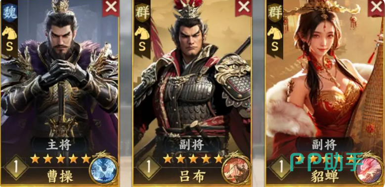 第三套阵容为主打范围伤害的群伤骑战组合,由曹操、吕布与貂蝉构成。该组合的核心在于曹操的被动增益技能,可为队伍中的主力输出提供显著的伤害加成。吕布作为顶级爆发型武将,本身具备大范围AOE能力,在曹操的加持下能进一步放大输出潜力,实现短时间内清场的效果。