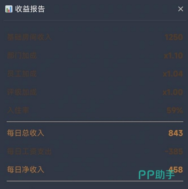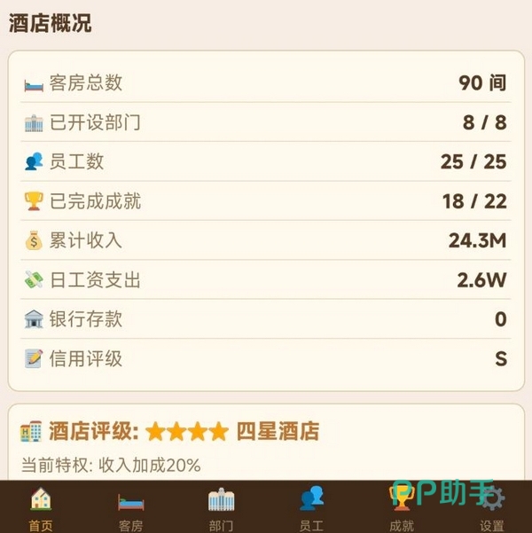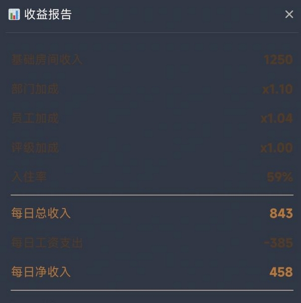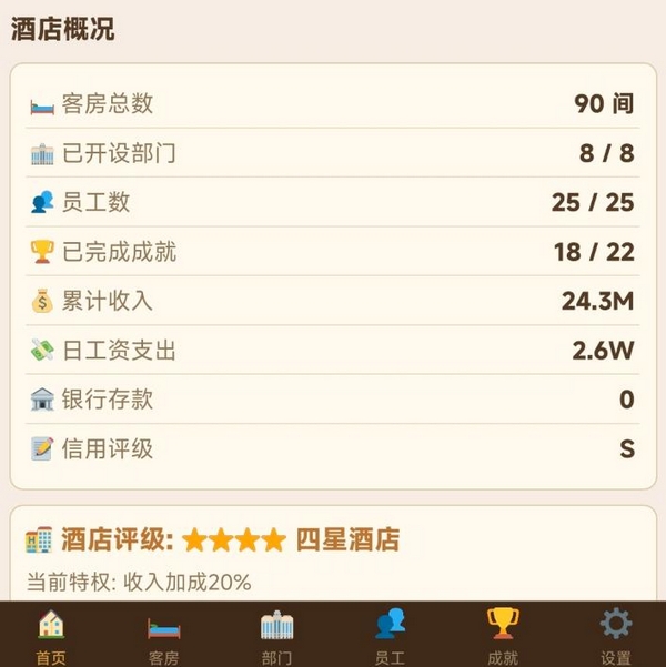 系统定期生成经营报表,清晰呈现日度总收入、运营成本及净利润数据。员工培训模块可提升岗位执行效率,但当前版本在操作便捷性方面仍有优化空间:例如暂不支持批量升级功能;部分老旧房型无法折价回收;人事管理界面尚缺解聘选项;员工学历属性尚未在实际运营中体现明确作用。