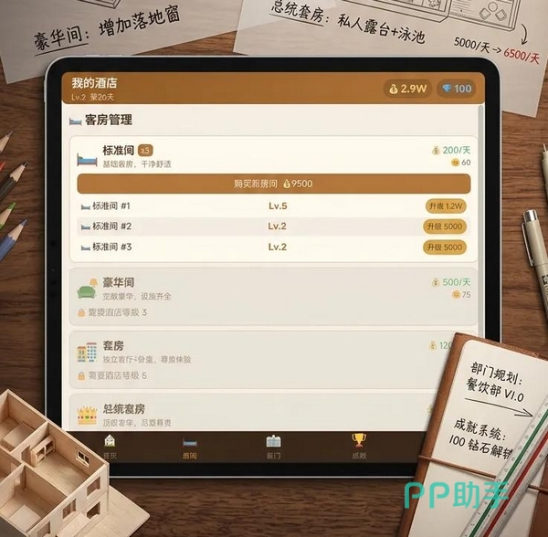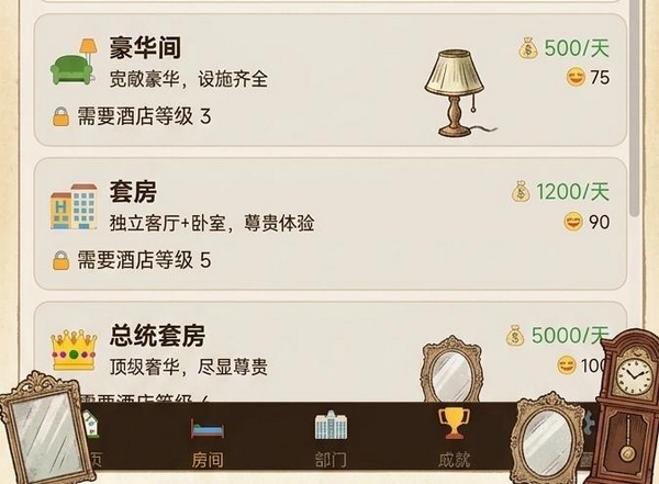 游戏中设有标准间、豪华间、套房及总统套房四类客房类型,对应不同定价体系与客户满意度反馈。每位访客均带有明确预算区间,因此房间配置比例、价格梯度设定与库存动态调整,共同构成核心经营决策点。