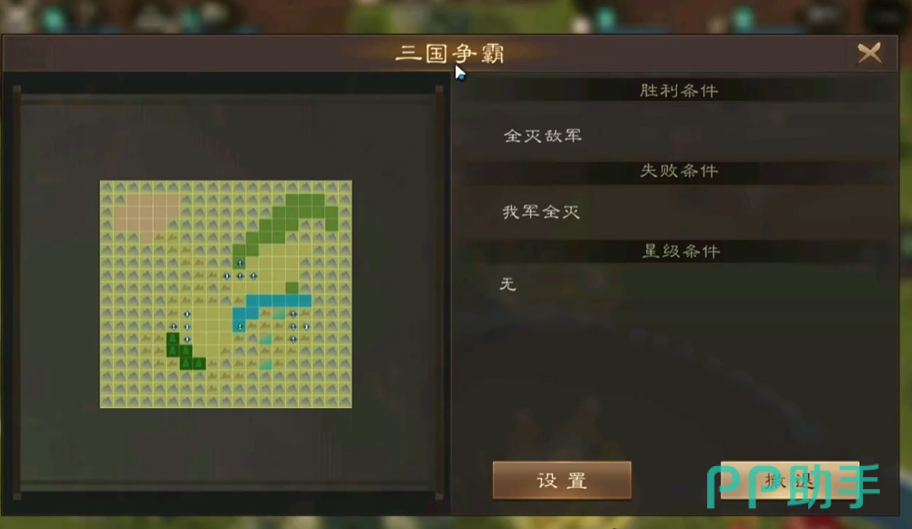 玩家们在右上角的通关条件中可以看到,胜利的条件是比较苛刻的,那就是要把敌方的部队给全部歼灭。在选择阵营的时候,小伙伴们最好是选择蜀国,因为相对来说蜀国的操作是比较容易的。在开战之后,玩家们可以看到自己需要打败的是吴国,而此时敌方有许多角色,脚底下的颜色都变成了红色,因此虽然说是要将敌方全部歼灭,但实际上只需要把这些变成红色的角色给打掉就可以了。