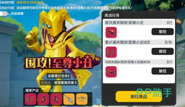 第二阶段开启后,持有围攻王牌的玩家即可组队或单人进入Boss战场。至尊小丑具备显著的技能前摇特征,攻击动作清晰但节奏紧凑,建议采用高频位移配合短时集火输出,严禁原地站桩输出。其血量上限极高,通常需多轮交锋才能完成击杀,合理规划技能冷却与走位路径是通关关键。