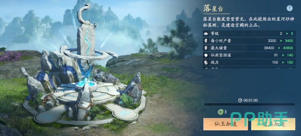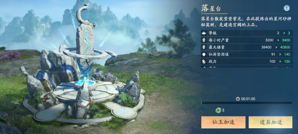 提升落星台单位时间星砂石产量的核心方式为建筑本体升级;此外,主殿等级提升亦可带来协同加成——当主殿升至对应阶段后,将激活“加速池”功能模块,该模块虽不直接作用于落星台,但能显著缩短主殿自身升级周期,从而间接加快落星台升级节奏,形成正向循环。