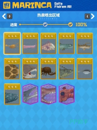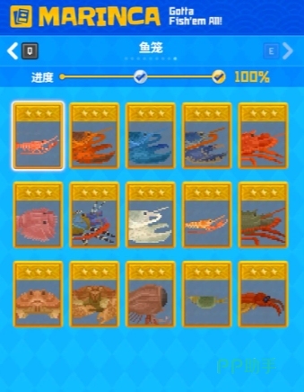 鱼笼区域的收集进度也为100%,这是一个人造的水域,通常设置在浅海地带,方便玩家进行日常的捕捞和收集。鱼笼中隐藏着一些较为罕见的鱼类和海洋生物,玩家需要使用特定的工具才能打开鱼笼,获取里面的卡片。鱼笼区域的探索相对轻松,适合玩家在游戏初期建立资源库。