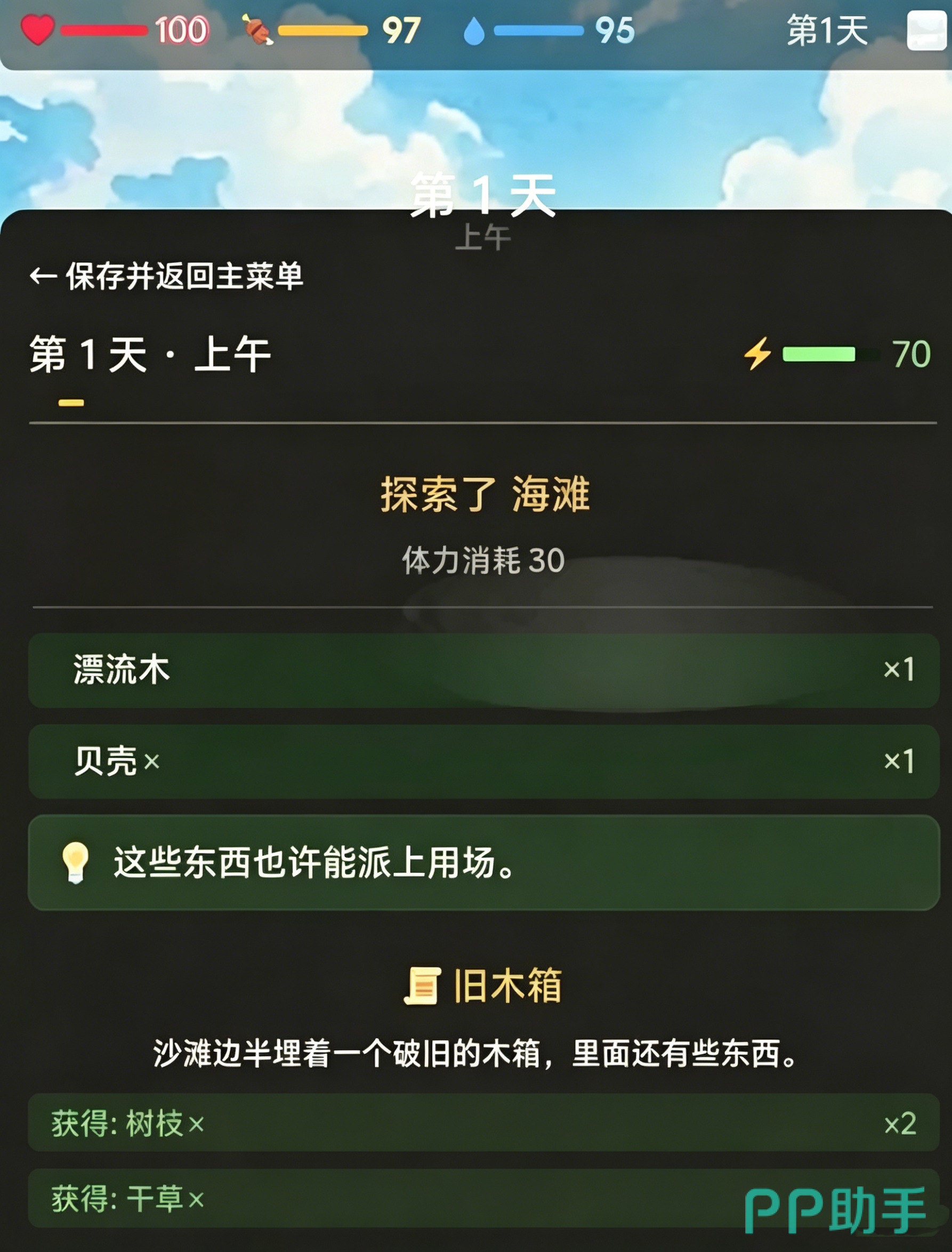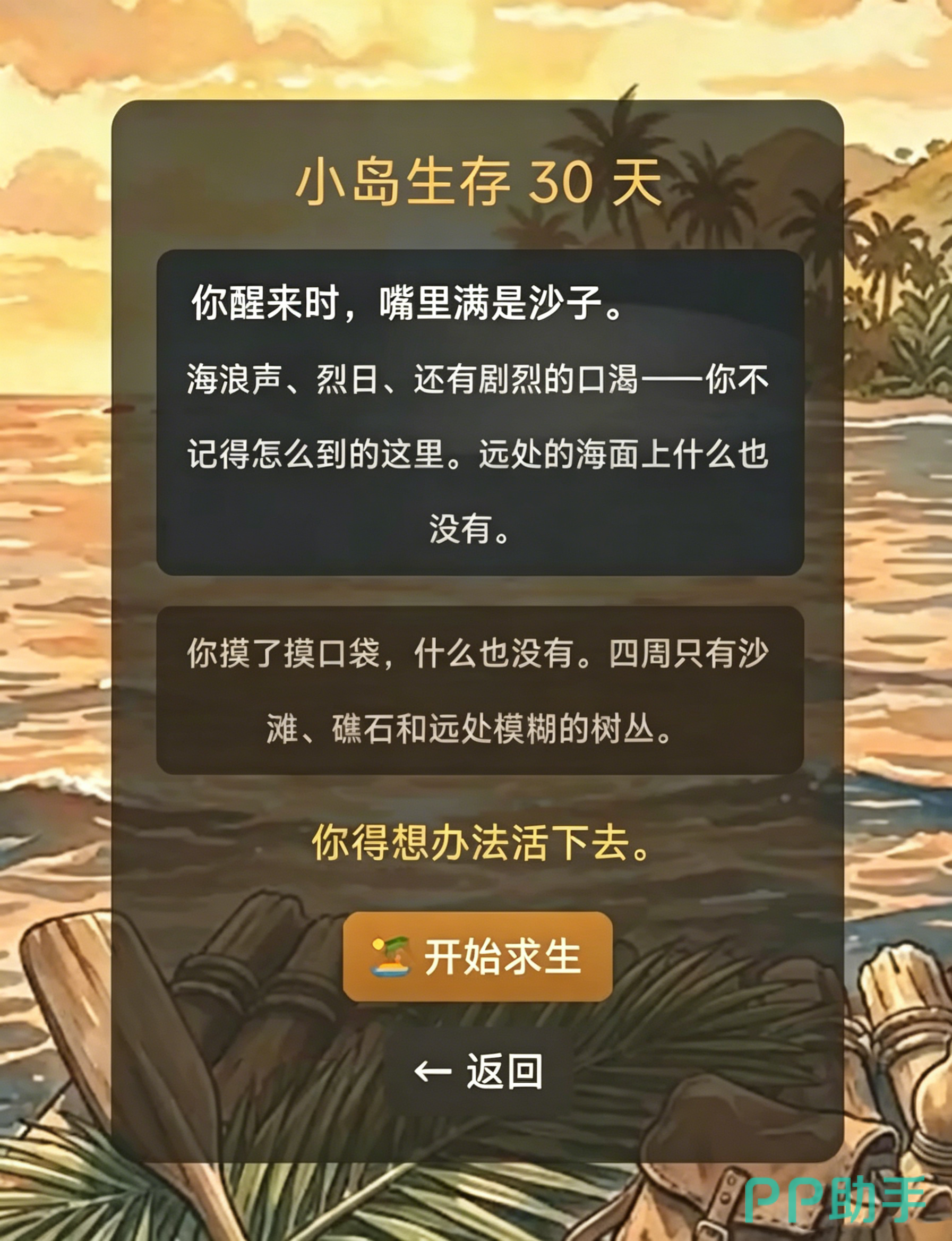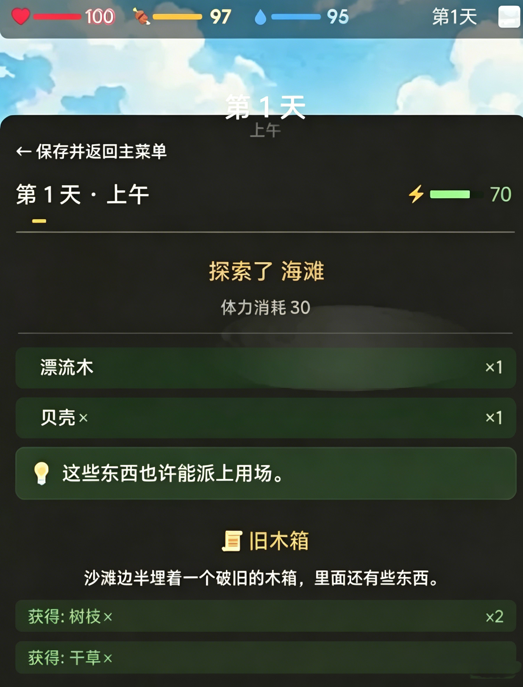 游戏内嵌实时状态面板,动态呈现角色生命体征、环境威胁等级与物品栏容量。行动选项始终围绕生存逻辑展开:当体力低于临界值,系统将提示“就地休整”;若发现椰林区域,则可触发采集支线,逐步解锁岛屿生态图谱。30日周期结束后,主线通关达成,但开放世界探索持续生效——例如集齐全部椰子品种,将激活隐藏成就与海岛编年史彩蛋。