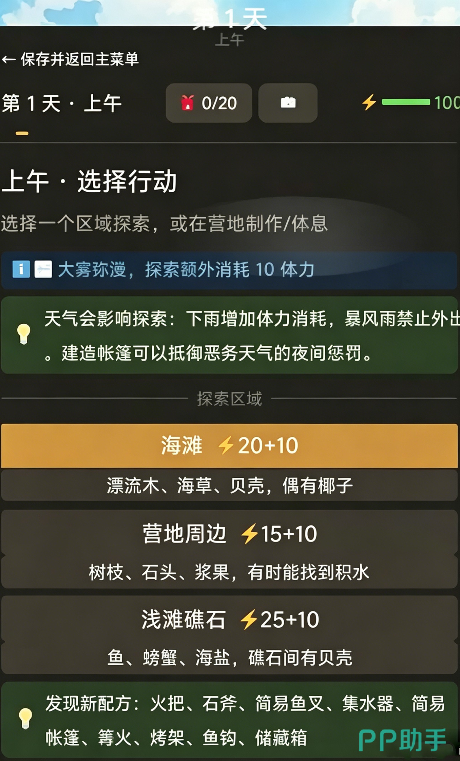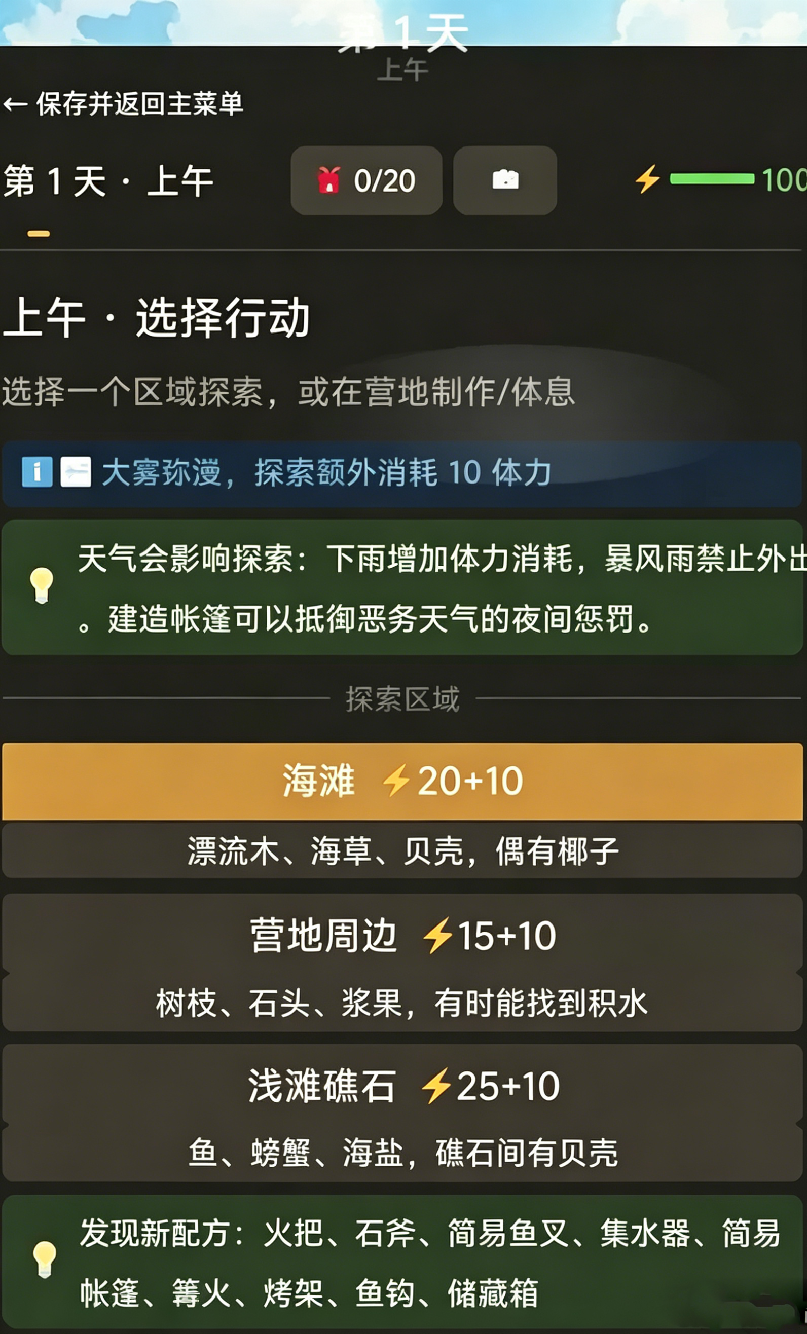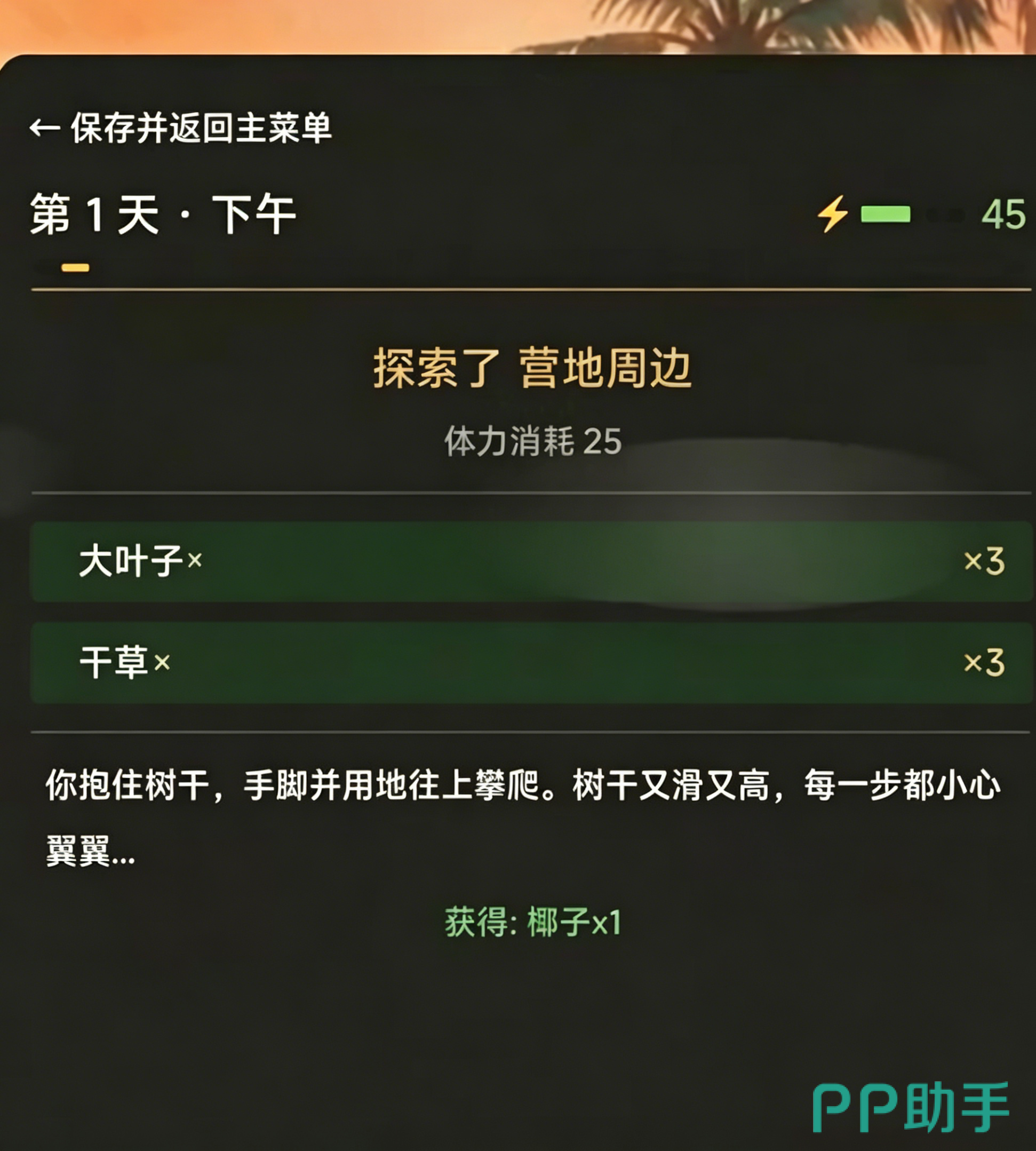 游戏内嵌实时状态面板,动态呈现角色生命体征、环境威胁等级与物品栏容量。行动选项始终围绕生存逻辑展开:当体力低于临界值,系统将提示“就地休整”;若发现椰林区域,则可触发采集支线,逐步解锁岛屿生态图谱。30日周期结束后,主线通关达成,但开放世界探索持续生效——例如集齐全部椰子品种,将激活隐藏成就与海岛编年史彩蛋。