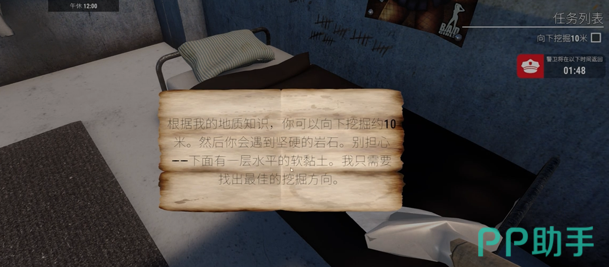 挖掘隧道是一项耗时且消耗体力的任务。每次挖掘都会减少角色的体力值,当体力归零时将无法继续作业。为了提升效率,建议尽早获取合适的工具。每天中午用餐时段,可以多领取一副筷子和一只勺子作为初期挖掘装备。返回牢房后,掀开地面地毯即可开始挖掘。由于挖掘过程会产生明显噪音,必须时刻警惕狱警巡逻。每隔一段时间,需探头观察走廊情况,避免在施工时被发现,否则将直接导致游戏失败。