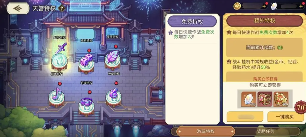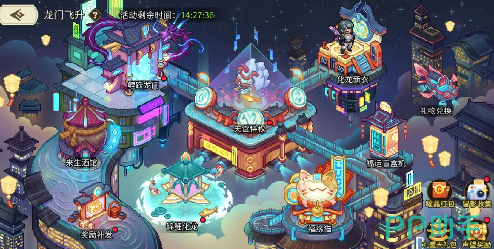 玩家可在天宫场景中交互触发六大限时免费特权,涵盖体力恢复、经验加成、掉落翻倍等实用功能;若购买指定活动礼包,还可解锁特权升级效果,进一步提升收益效率。此外,每日可消耗曜晶兑换锦鲤,不同品级锦鲤对应不同档位随机奖励,其中高级锦鲤出货率含更高价值道具及稀有养成资源。