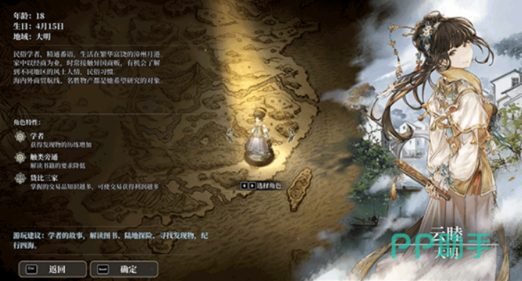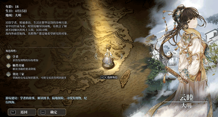 云睦出生于福建漳州商人家庭,自幼接受系统化人文教育,通晓多国语言,对地理志、风俗录及跨文化贸易体系有深厚兴趣。其家庭商业网络广泛接触海外客商,使她得以积累大量一手域外见闻。为完成一部兼具学术性与实证性的环球风物志,她决定亲自扬帆出海,实地考察不同文明区域的自然环境、社会结构与经济形态。在游戏中,云睦聚焦知识生产与商业转化:发现新文物或遗迹时经验增幅显著,解读古籍类文本所需门槛降低,且掌握的交易品知识越全面,市场交易收益越高。
