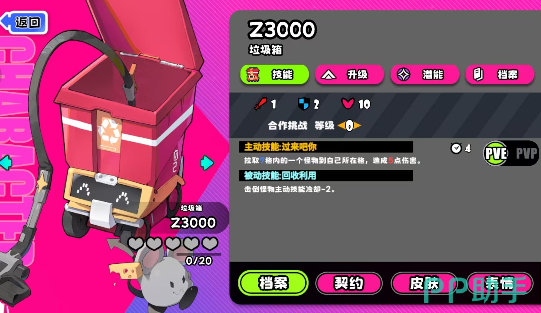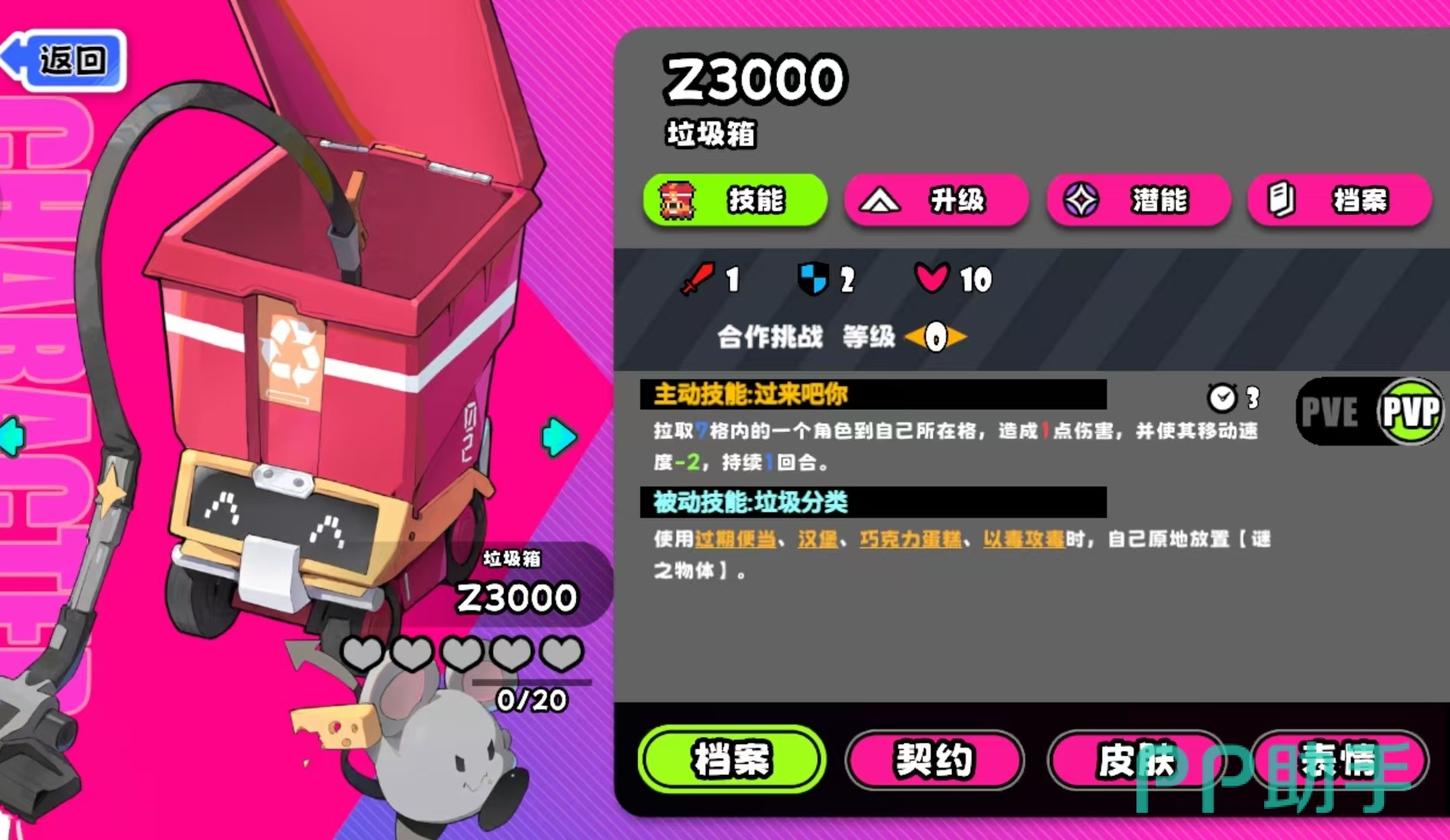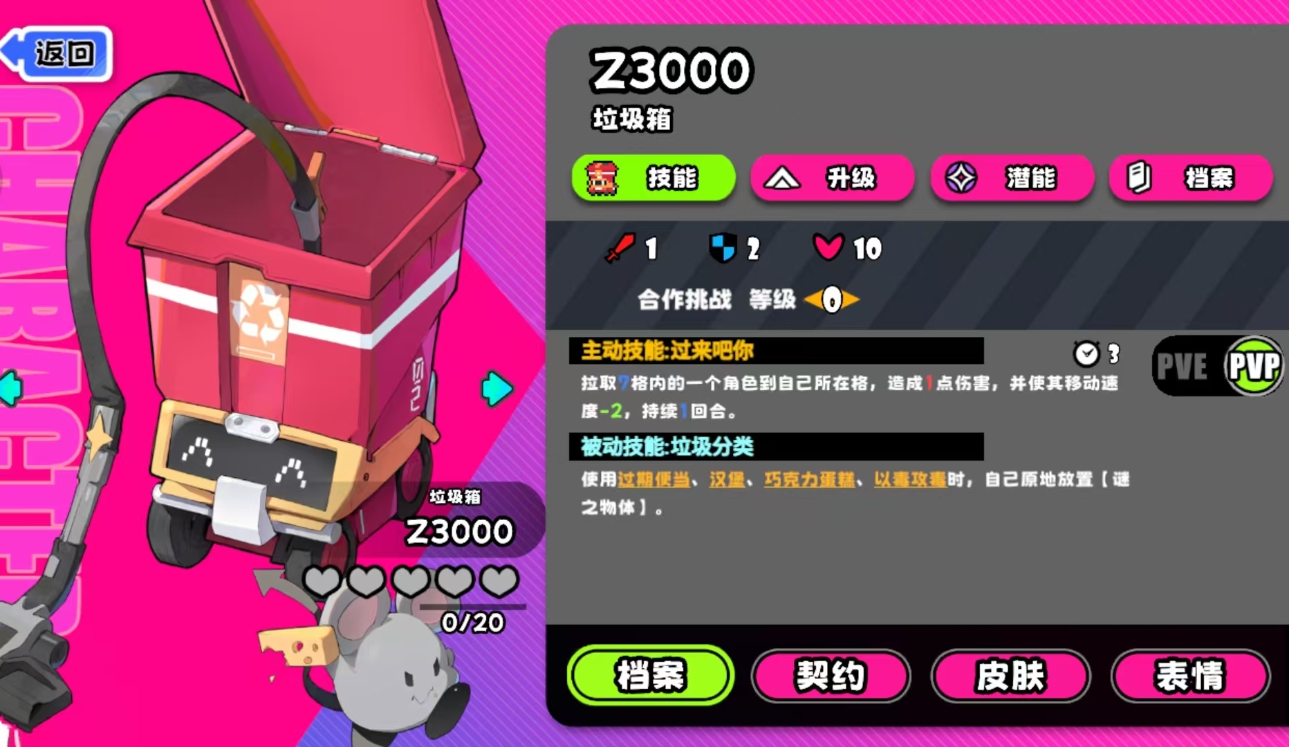 在PVP对战模式下,垃圾桶的主动技能作用范围为7格,命中后造成2点固定伤害,并使目标移动速度降低2点,持续至下一回合结束。其被动效果则与手牌联动:每当玩家打出“过期便当”等特定手牌时,将在当前所处格子生成一个“迷之物体”。若对手后续移动至此格,将立即触发相应负面效果。该机制支持预判布控与地形压制,在标准对局中常被用于围堵残血目标、高效收割星币资源。