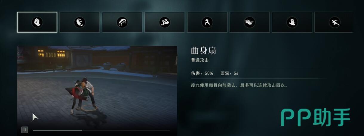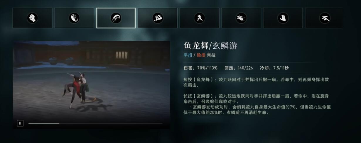 先来看基础攻击方式,凌九的普攻为曲身扇,共四段连击,每段造成50%伤害,完整打出一套可回复54点炁。前三段均可取消后摇,操作灵活度高,第三段结束后会有收扇动作,不影响实战节奏。一技能玉环钩具备控制与衔接能力,短按可投掷扇子牵引目标并接普攻,范围较小但判定精准;长按则在拉人后触发蛇仙噬咬,伤害由74%提升至125%,并能破防浮空单位,代价是消耗7%生命值,同时带来更高回炁收益——短按回148,长按回250,冷却时间分别为7.5秒和10秒。