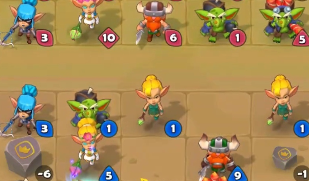 阵容核心由米诺陶担当,其定位为冲锋型战士,兼具不俗防御与高额输出。凭借“蛮力”技能,米诺陶可将敌方单位击退甚至撞飞,打乱对方阵型,为后排创造输出空间。配合狮鹫的收割能力,可在混乱中快速清除残血目标。同时,果冻骑士作为前排另一关键角色,以其卓越的抗伤能力稳固防线,确保主力输出单位在后续回合中仍能正常运作。