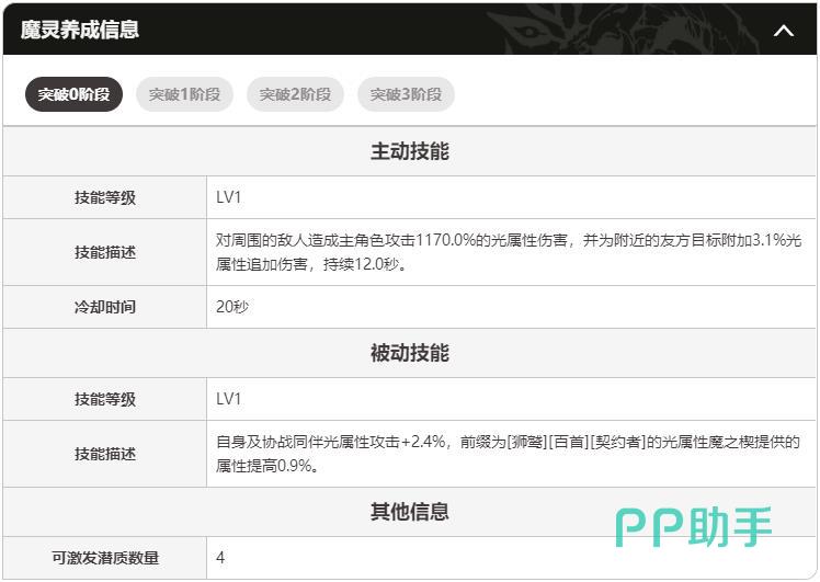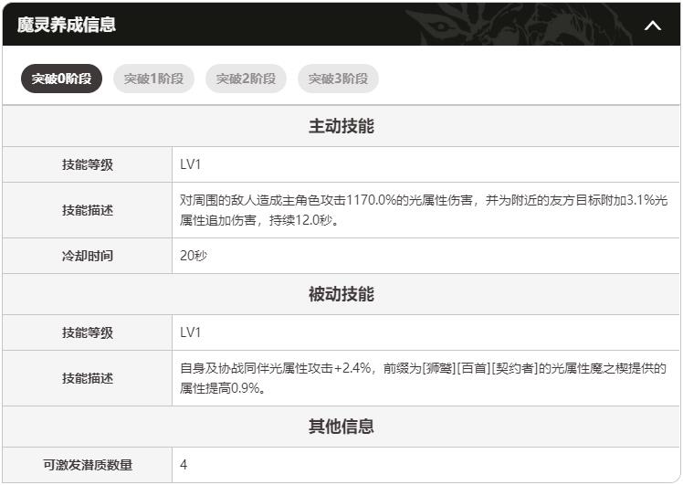 其被动技能则侧重于长期属性强化,不仅提升自身基础攻击力,还能使同队中的所有光属性成员获得攻击加成。此外,当队伍配置含有特定前缀的光属性魔之楔时,该被动将进一步激活额外强化效果,使魔之楔提供的属性收益进一步放大。这种机制使其在光属性阵容中具有极强的协同价值,能够有效提升全队战斗效能。