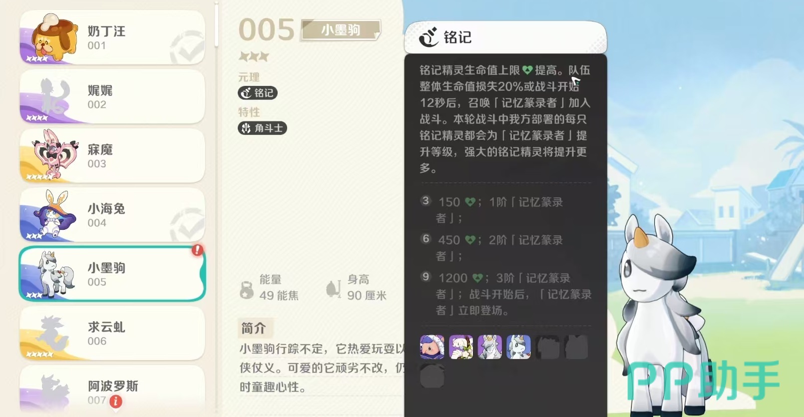 小墨驹身形小巧,仅有90厘米高,能量值为49能焦,性格活泼好动,行踪不定,带有浓厚的童真色彩。其核心元理为“铭记”,拥有“角斗士”特性。在元理机制上,所有携带铭记标签的精灵均可提升全队生命上限。当队伍整体生命值损失达到20%,或战斗开始满12秒后,系统将召唤出“记忆篆录者”参战。每部署一只铭记精灵,记忆篆录者的等级便会提升一级,且高品质铭记精灵可加速该成长过程。